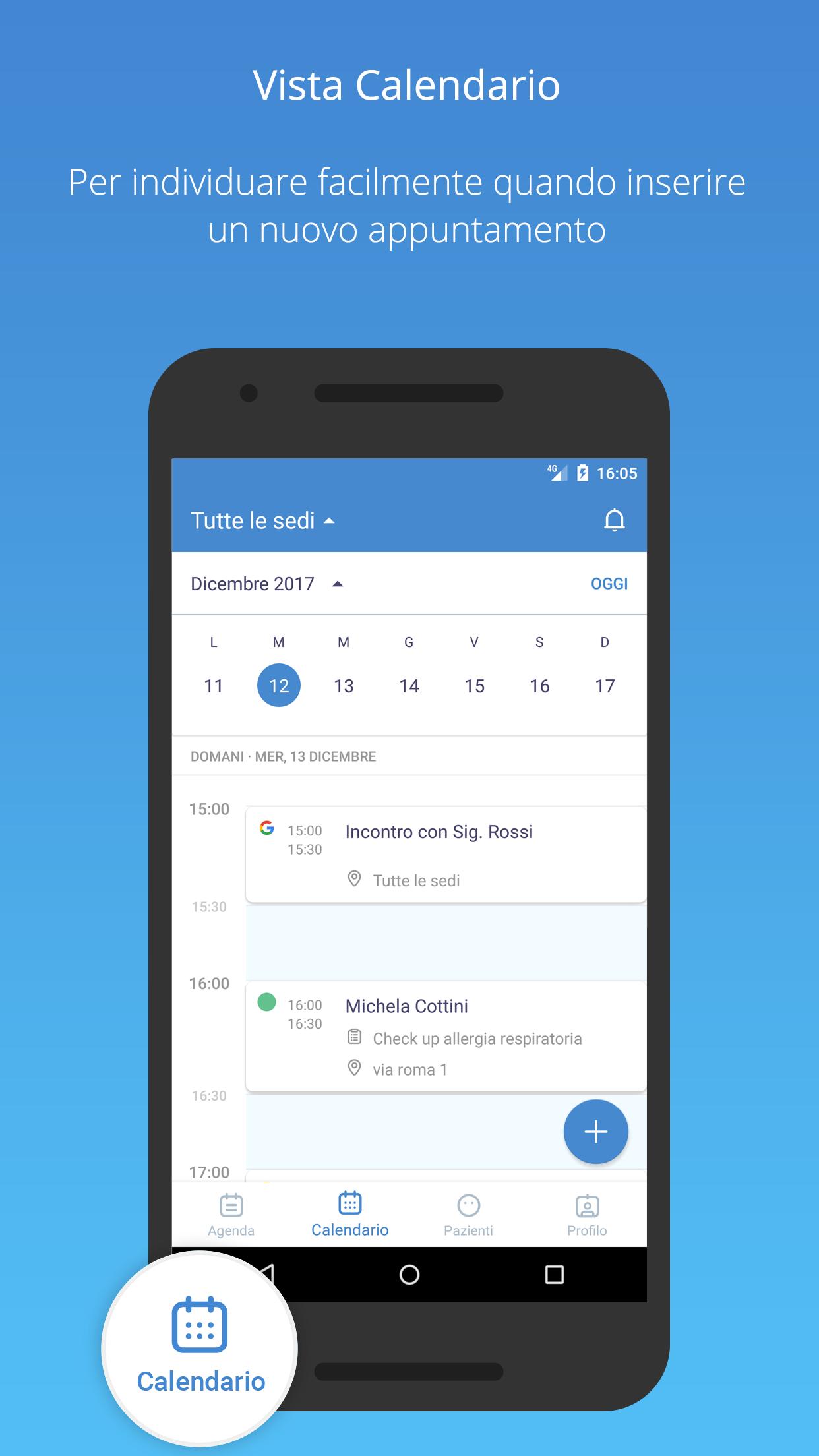 AgendaDottori is in fact an agenda of the commitments already set, a calendar where you can insert the new ones and a marketing tool that communicates natively with your professional agenda on Dottori.it, the site for the online booking of visits and specialized performances in Italy and used every month by over 1 million patients.