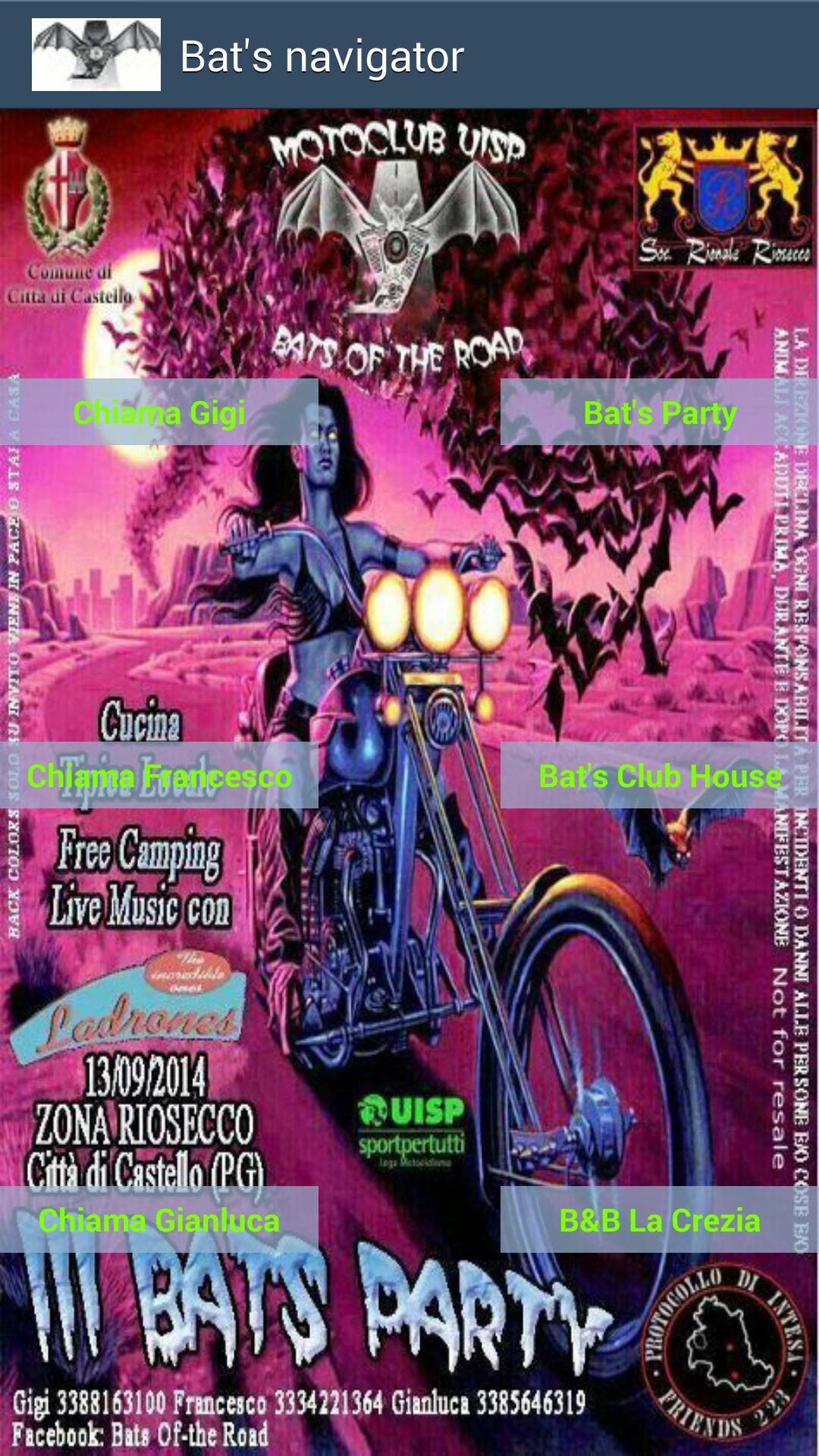 Small app for the Bats of the Road gathering. By clicking on the destinations, the app uses the Google Maps to lead you where times. By clicking on the names of Bats Bikers you can call them. The App obviously needs GPS, Internet connection and Google Maps installed. If you do not have Google Maps installed you will see a map from the Citta 'Citta' Nord of the E45 Castle up to the destination.