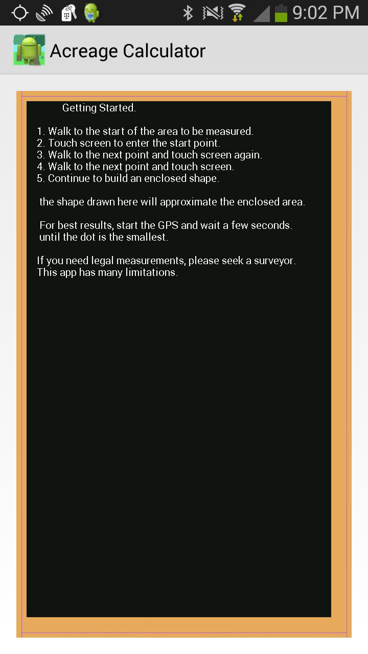 Eine schnelle Möglichkeit, den Bereich von etwas draußen zu überprüfen. Verwendet das GPS, um den Rand eines Gebiets zu erhalten, und berechnet die Fläche und die Quadratmeterzahl. Es ist auf die Genauigkeit des GPS zum Zeitpunkt der festgelegten Ecken beschränkt.