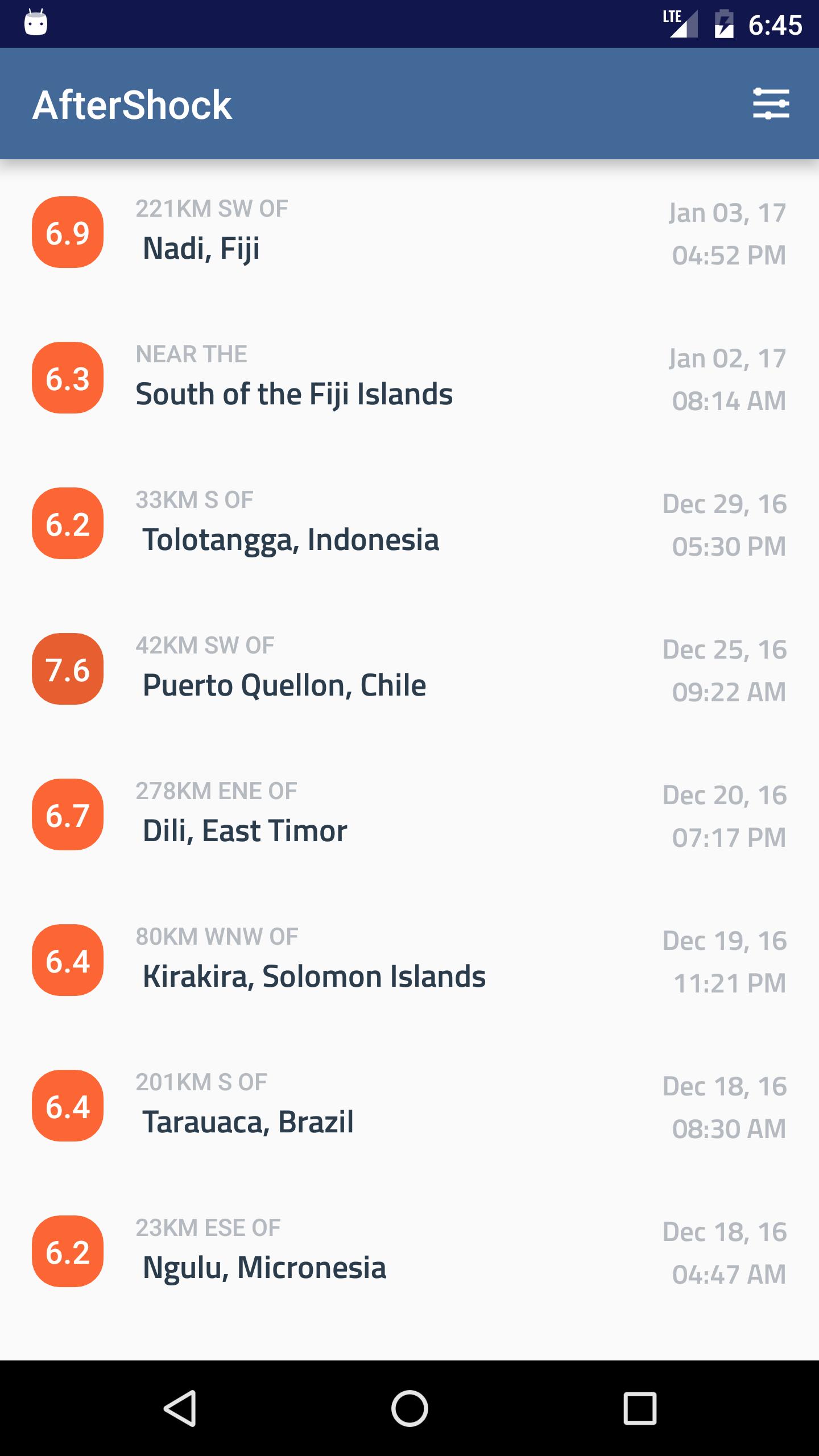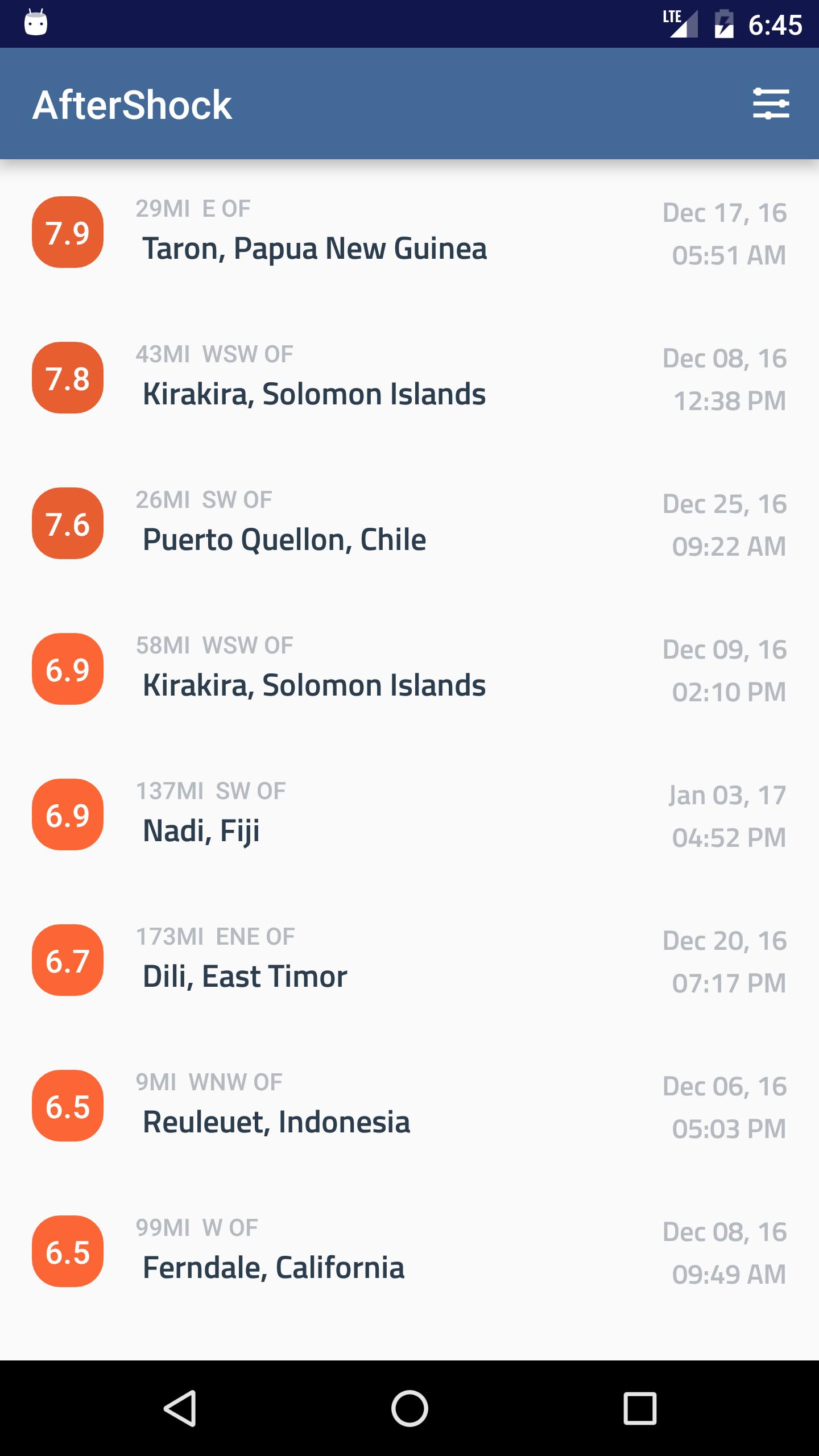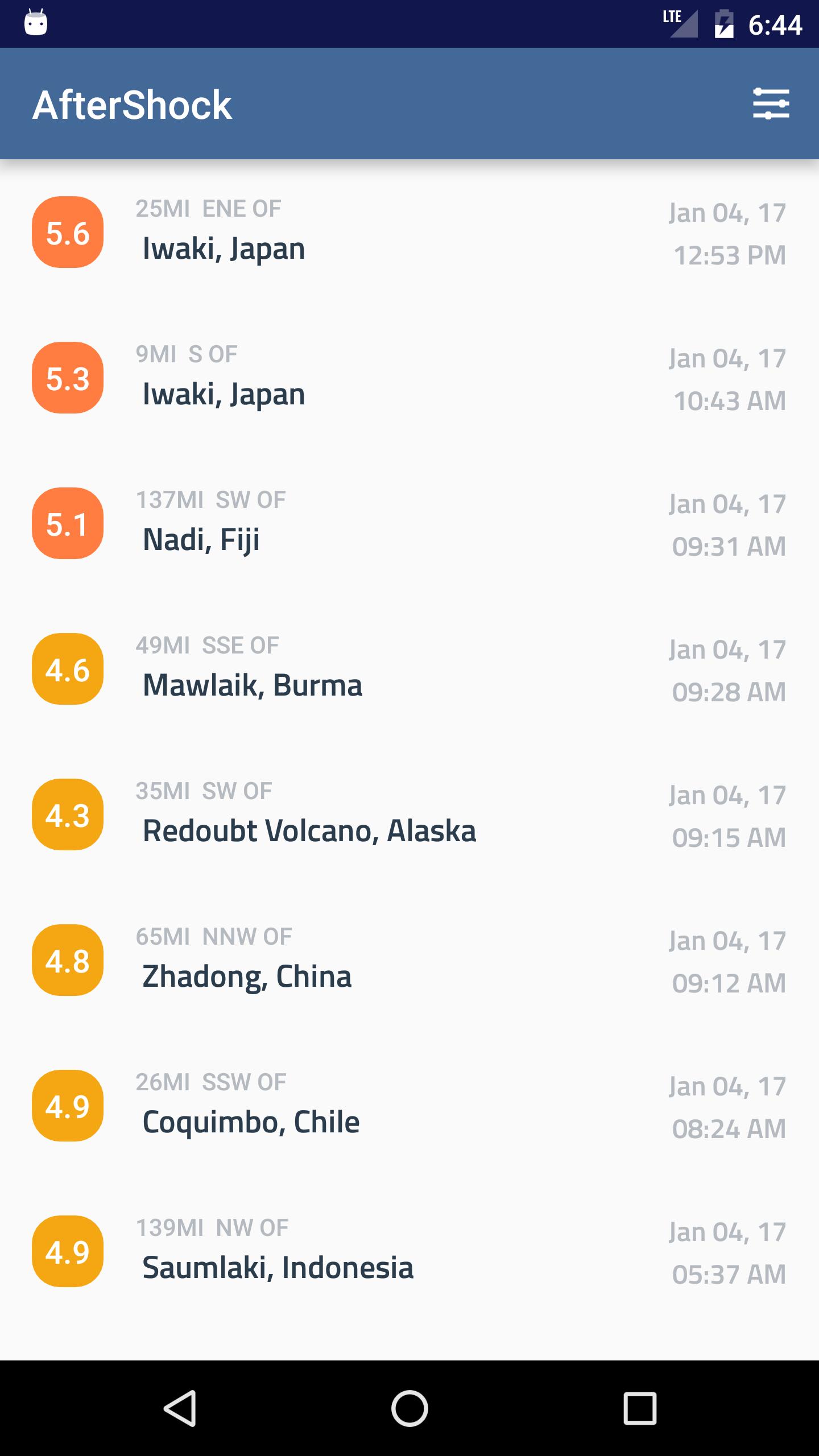 Unsere optimierte Schnittstelle bietet eine einfache Sicht auf die neuesten Erdbeben rund um den Globus, die auf Ihren Suchparametern basieren. Die Daten werden von den USGS (United States Geological Survey) bereitgestellt, mit der Sie Erdbeben von 1,0+ Größenordnung aus den Erdbeben der USA und der Größenordnung von 4,5+ betrachten können. Klicken Sie auf das Erdbeben, um für die Veranstaltung auf die entsprechende USGS -Website zu gelangen. Die Erdbeben nach jüngsten oder nach Größe leicht zu sortieren. Mit unserer App können Sie Ihre Ansicht zwischen Kilometern und Meilen wechseln.