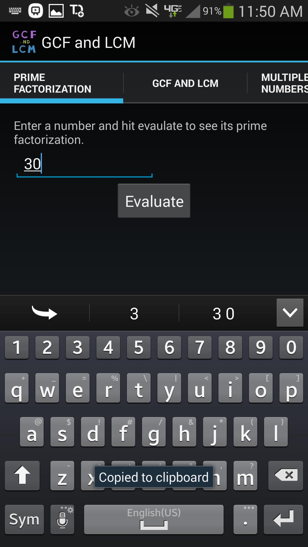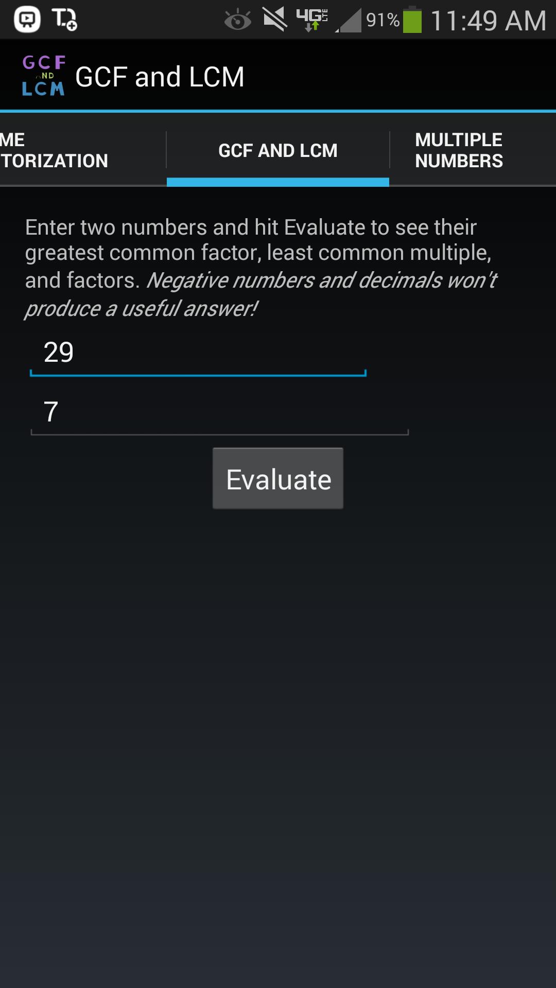 Haben Sie sich jemals über den größten gemeinsamen Faktor zwischen 234556 und 3245 gefragt? Das am wenigsten verbreitete Mehrfaches? Wie viele Gesamtfaktoren jede Zahl hat? Die Hauptfaktorisierung von 4856? Suchen Sie nach dem am wenigsten gebräuchlichen Nenner zwischen einer Reihe von Brüchen? Sie können nach dem LCM zwischen so vielen Ganzzahlen suchen, wie Sie möchten. Wenn Sie eine dieser Fragen mit Ja beantwortet haben, ist diese App sehr praktisch.