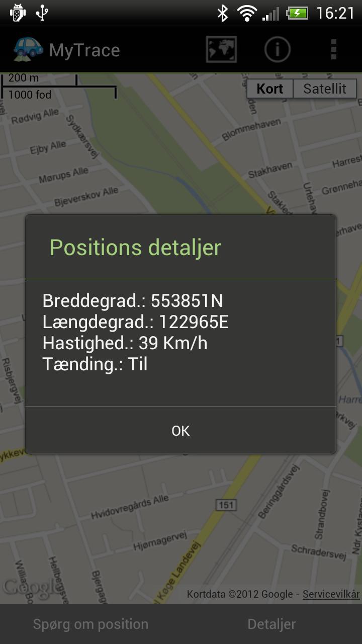 MyTrace kann mit dem GPS -System Dantrack und Defa verfolgen. Sie können den aktuellen Standort, die Geschwindigkeit und den Zündstatus für Geräte anfordern. Sie können auch nach dem aktuellen Status des Systems fragen.