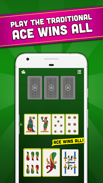 - Wählen Sie Ihr Deck: Ace Wins All ursprünglichen italienischen regionalen Decks (Napoletan, Siziliane, Piacentine, Piemontesi, Triestine und mehr), in hoher Auflösung, die auf Ihrem Telefon und Tablet Android erstaunlich aussieht. Oder Sie können mit den klassischen Pokerkarten (Französisch) spielen!