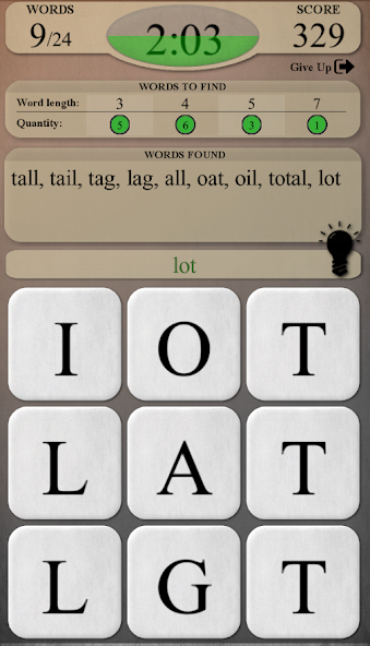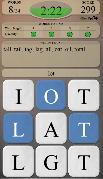 - Finden Sie alle versteckten Wörter auf dem Board mit der Verwendung der verfügbaren Buchstaben.