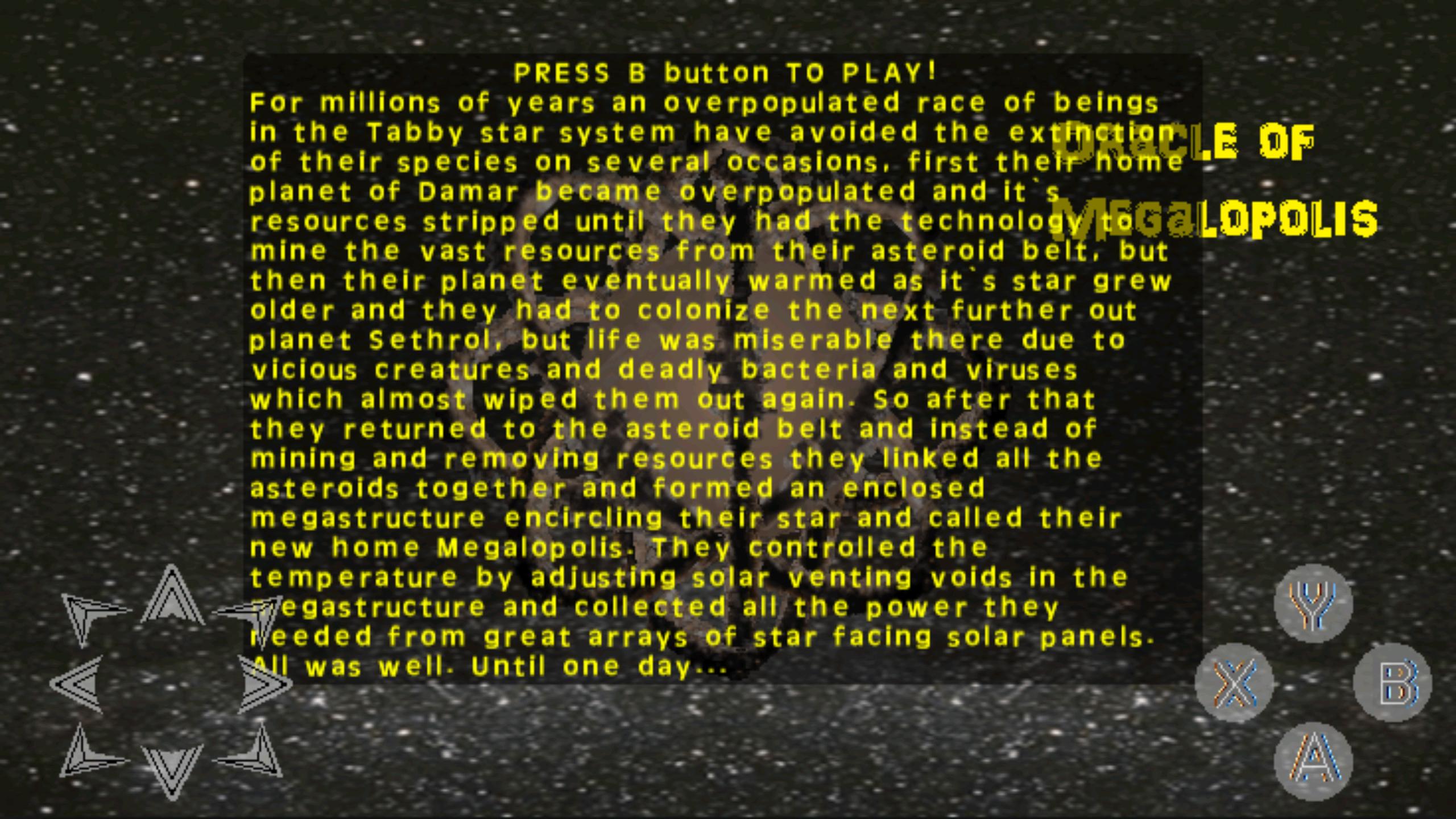 In diesem Spiel müssen Sie den Bürgern von Megalopolis helfen, ihrer Apokalypse durch die Materialisierung eines Wurmlochs zu entkommen, das ihren Gaststar verschlingt. Es gibt mehrere Missionen, die Sie abschließen können, von denen einige die Mathematik verwenden oder sich an Koordinaten erinnern müssen, die Wissenschaftler Ihnen in der Treffenszene auf Planet Frozania geben. Die erste Mission ist unabhängig von den anderen Missionen, aber die nächsten 3 hängen von dem Wetter ab, von dem Sie die Missionen erfolgreich abschließen, und die letzte Mission kann nur erreicht werden, wenn Sie die vorherige Mission erfolgreich abgeschlossen haben. Nach jeder Mission speichert das Spiel automatisch einen Screenshot im Logbuch. Sie können auch Screenshots darauf speichern, wenn Sie möchten, indem Sie die Eingabetaste (Windows) oder B (Game Pad, Android) drücken und das Logbuch über das Menü anzeigen. Es gibt 8 verschiedene Endszenarien, die davon abhängen, wie gut Sie alle Missionen abgeschlossen haben.