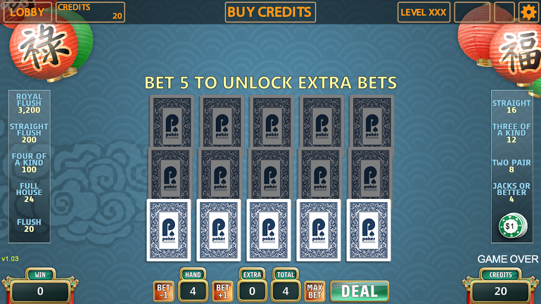 Erleben Sie den klassischen Videopoker mit einer Wendung. Für jede Karte in der Hand können Sie bis zu zwei zusätzliche Ersatzkarten wetten. Mit bis zu zehn zusätzlichen Karten im Spiel bietet Ihnen dieses schnelllebige Pokerspiel zusätzliche Möglichkeiten, um zu gewinnen und strategischere Möglichkeiten, um Ihre Fähigkeiten zu testen. Wenn Sie ein Fähigkeits -Video -Pokerspieler sind, werden Sie dieses Spiel lieben.