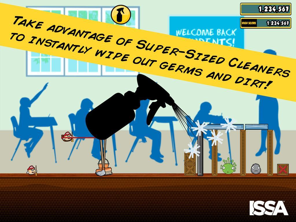 El juego Angry Janitors presenta cuatro etapas: la escuela, la oficina, el hospital y el restaurante, cada uno con 10 niveles. Acumularás puntos a medida que elimine la suciedad y los gérmenes en cada nivel y ganes los zonas doradas cuando publique puntajes altos. Vea cómo se compara con otros limpiadores con la tabla de clasificación superior e incluso obtenga consejos sobre el valor de la limpieza adecuada a medida que avanza en el juego.