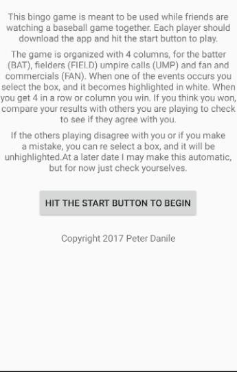 Si quieres mantener interesante tu juego de equipos de béisbol favorito durante el fin de semana, intenta jugar bingo de béisbol. Es una excelente manera de ayudar a sus amigos a mantenerse involucrados en un juego de movimiento lento. Nuestros juegos tienen elementos que se enumeran en 4 categorías: Bating (BAT), Fielding (Field), Umpire (UMP) y Fan (Fan). Después de que usted y sus amigos hayan descargado la aplicación, o obtuvieran una tarjeta de bingo de béisbol de papel gratuita, simplemente comience a ver el juego. A medida que ocurren las jugadas o se juegan los comerciales, y ves uno de los artículos en tu carta, gritas a los demás en tu fiesta y marca tu carta. Cuando obtienes 4 en una fila, columna o diagonal ganas. Lo que ganas depende de ti y tu grupo. Puedes probar el juego en tu próxima fiesta descargando las tarjetas gratuitas de nuestro sitio web baseballbingo Pro.com y probándolo tú mismo. Este juego está destinado a jugar con grupos pequeños, y te animan a gritar cuando veas algo en tu carta y discutir el punto con tus amigos mientras juegas. Si lo desea, cree sus propias reglas, como establecer un límite de tiempo. Esperamos que disfrutes de nuestros juegos.