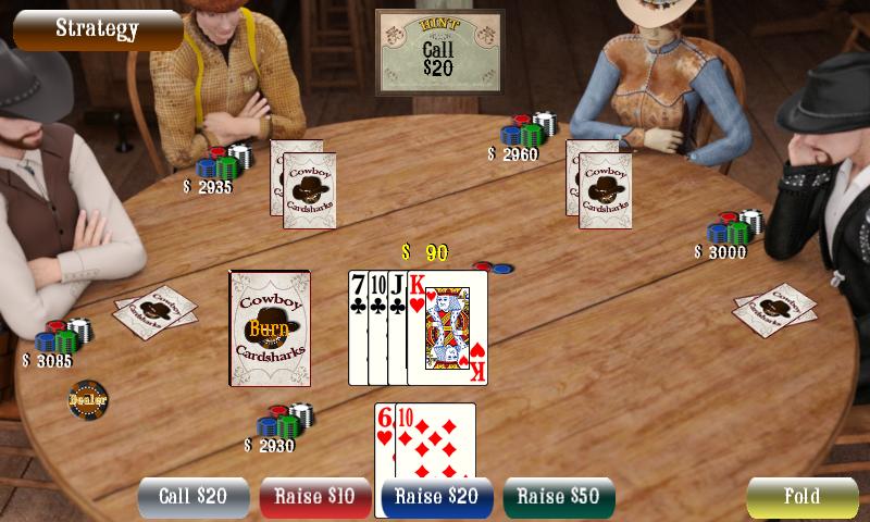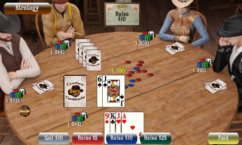 ¡Aprenda a jugar al póker de Hold'em de cuatro tiburones de cartas de broma que intentarán tomar su dinero! Aquí en el Viejo Oeste, jugarás contra Annie, Cowboy, Gambler y The Kid. Cada jugador tiene su propio estilo de juego único, y jugar contra esos estilos, combinado con las pistas y la estrategia basada en el contexto, debería ayudarlo a aprender a jugar al póker.