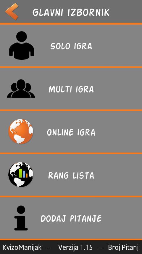 KvizoManijak se puede jugar de tres maneras. El primero es el juego en línea en el que juegas contra todos los oponentes que están actualmente en línea. Otra forma es un juego multijugador en el que puedes jugar contra algunos amigos. La tercera vía es un juego en solitario en el que juegas solo y te preparas para el juego en línea o multijugador.