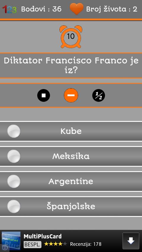 KvizoManijak es un juego de conocimiento que puedes jugar junto con amigos, con jugadores desconocidos o puedes practicar a ti mismo antes de enfrentarse con oponentes reales. KvizoManijak es un cuestionario que consta de 950 preguntas de diferentes categorías.