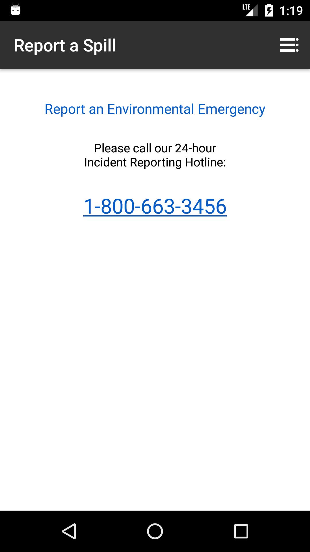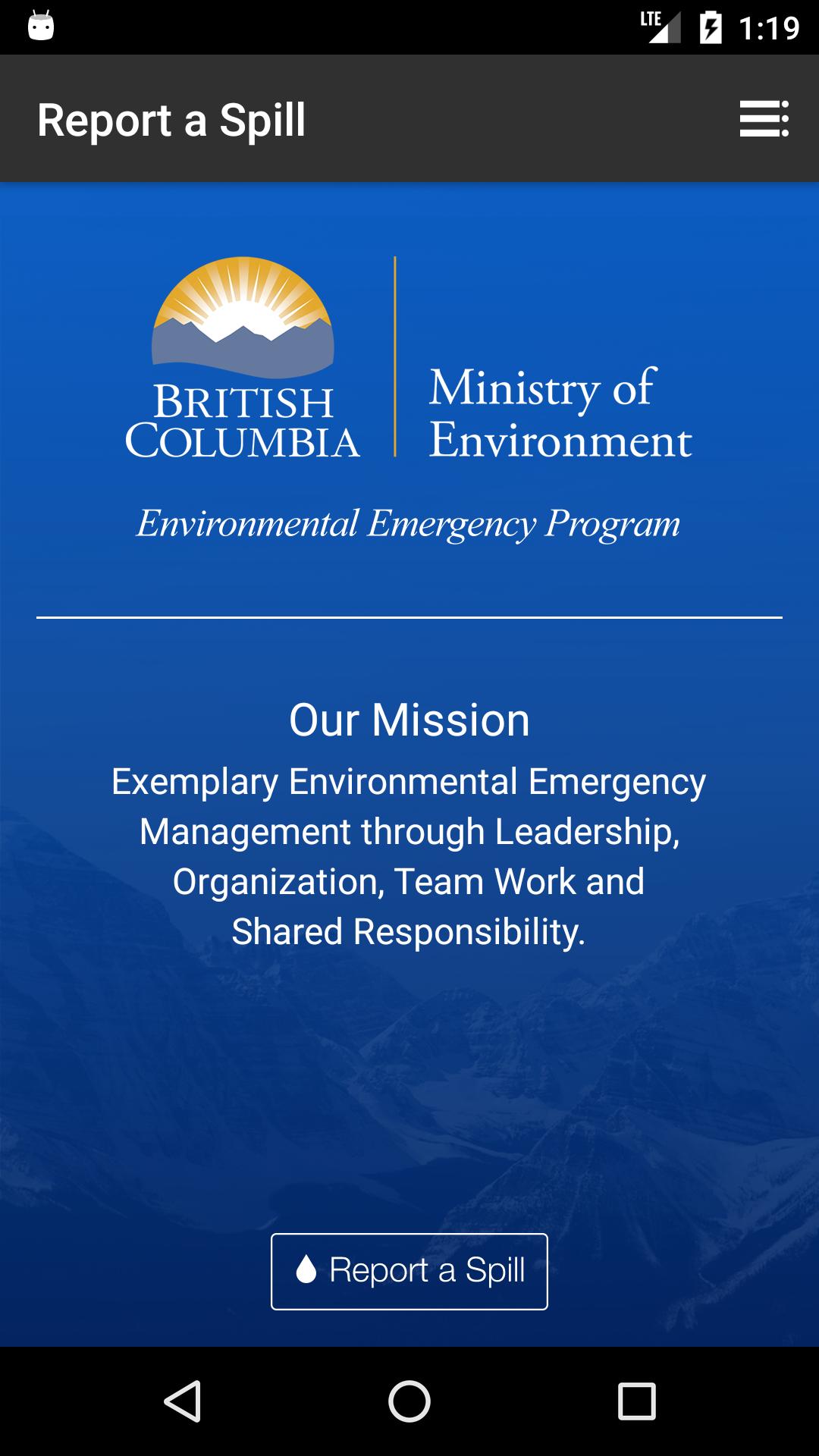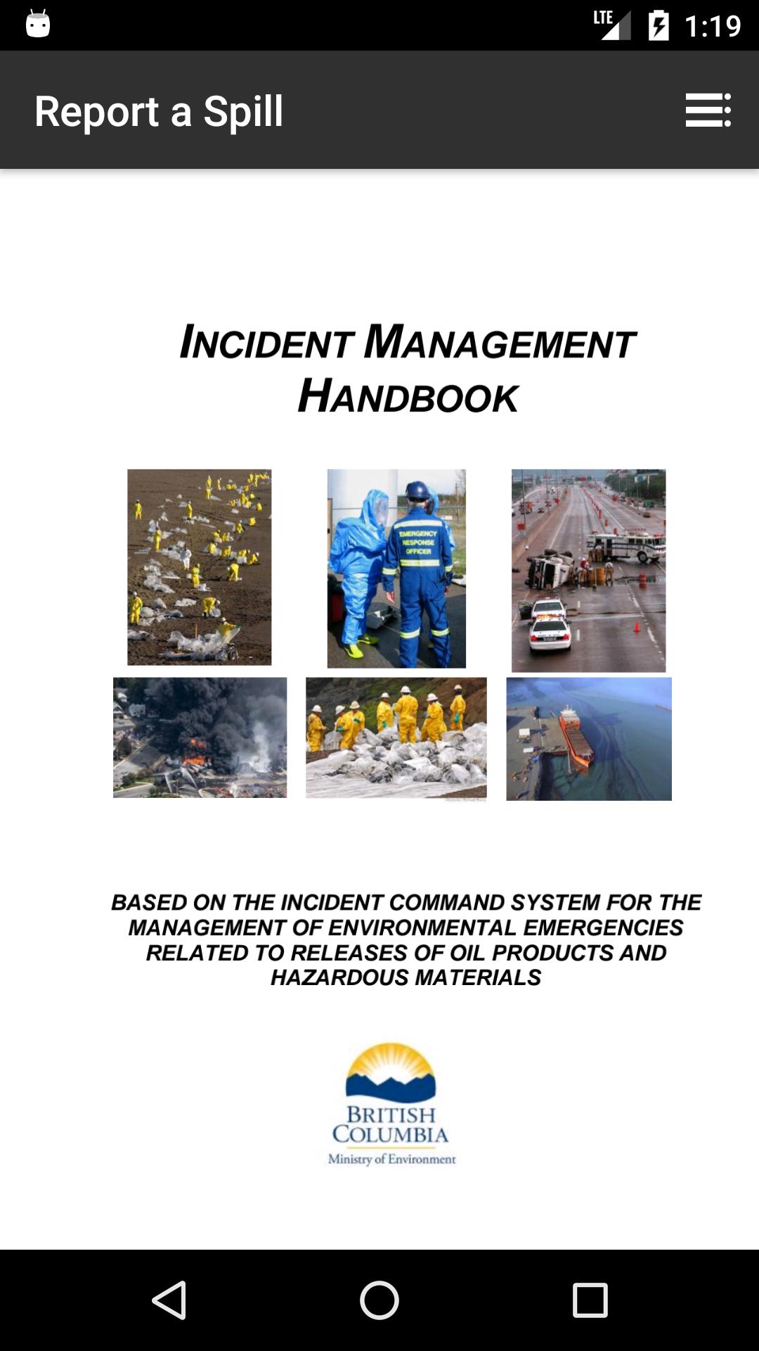 Au sein de l'application, vous pouvez Report a Spill en Colombie-Britannique, examiner le Règlement sur les rapports des déversements de la Colombie-Britannique, la BC Environmental Management Act, accéder à notre manuel de gestion des incidents et à d'autres documents de réponse de déversement. Accédez également aux coordonnées de tous les emplacements régionaux de bureau de la Colombie-Britannique.