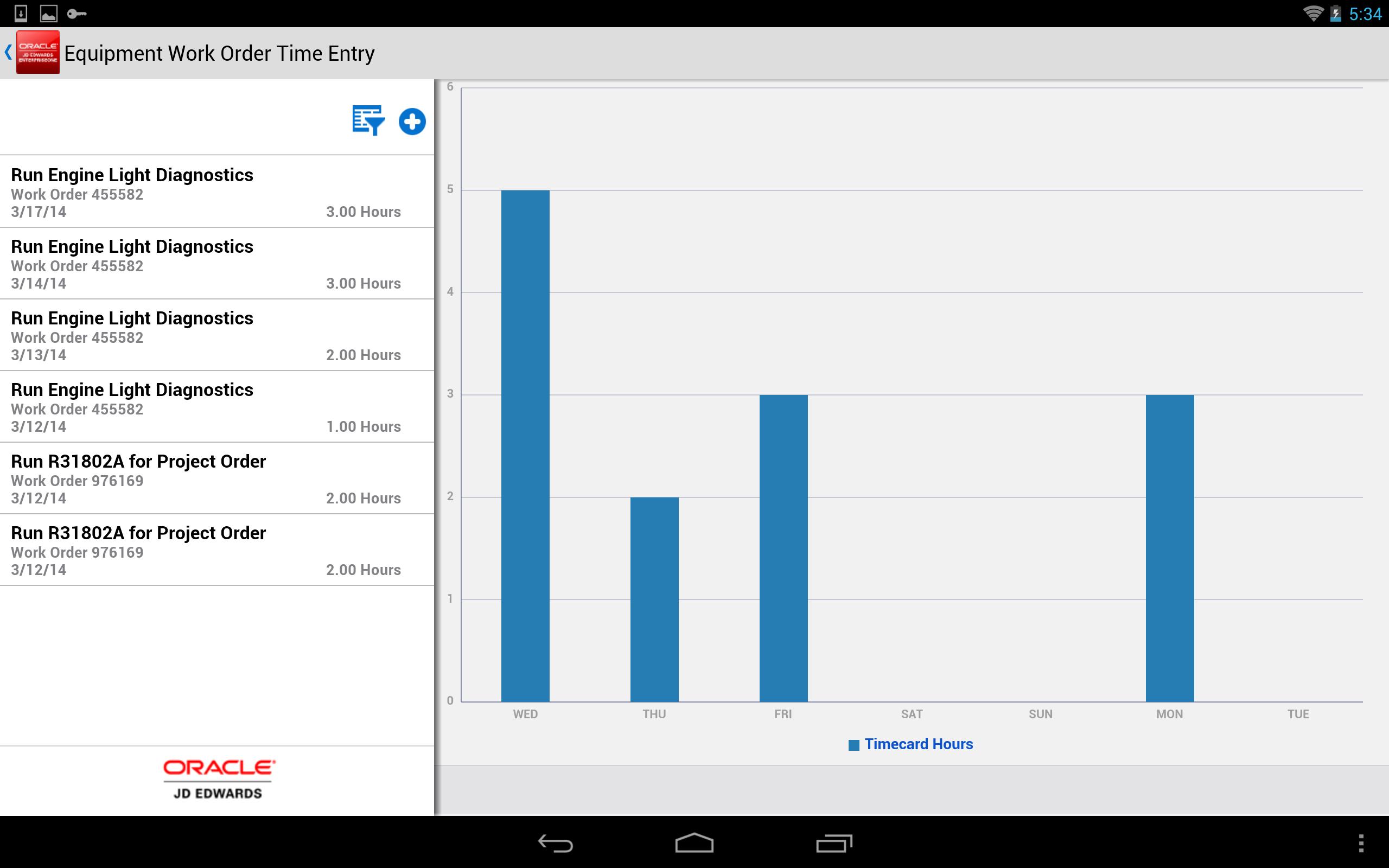 JD Edwards EnterpriseOne Equipment Ord Commande de travail Tablet Tablet mobile permet aux techniciens de maintenance de créer et de visualiser les cales associées aux travaux terminés sur l'équipement appartenant à l'entreprise (entrez le temps pour les travaux effectués via des bons de travail d'équipement). Le peut voir une liste du temps entré au cours des 7 derniers jours et explorer les détails. Le temps est également présenté via un graphique.