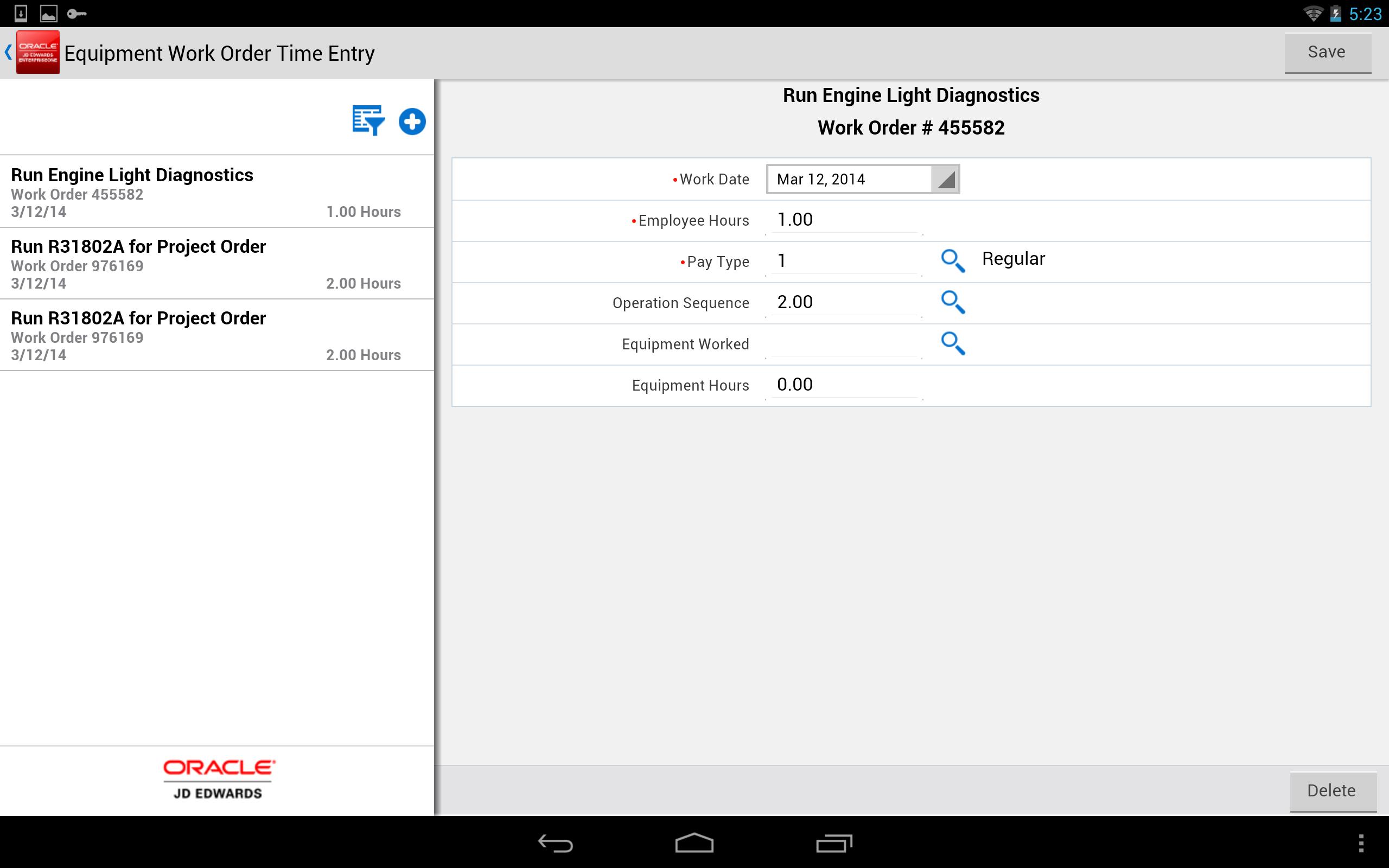 JD Edwards EnterpriseOne Equipment Work Ondrand Entry pour la tablette mobile