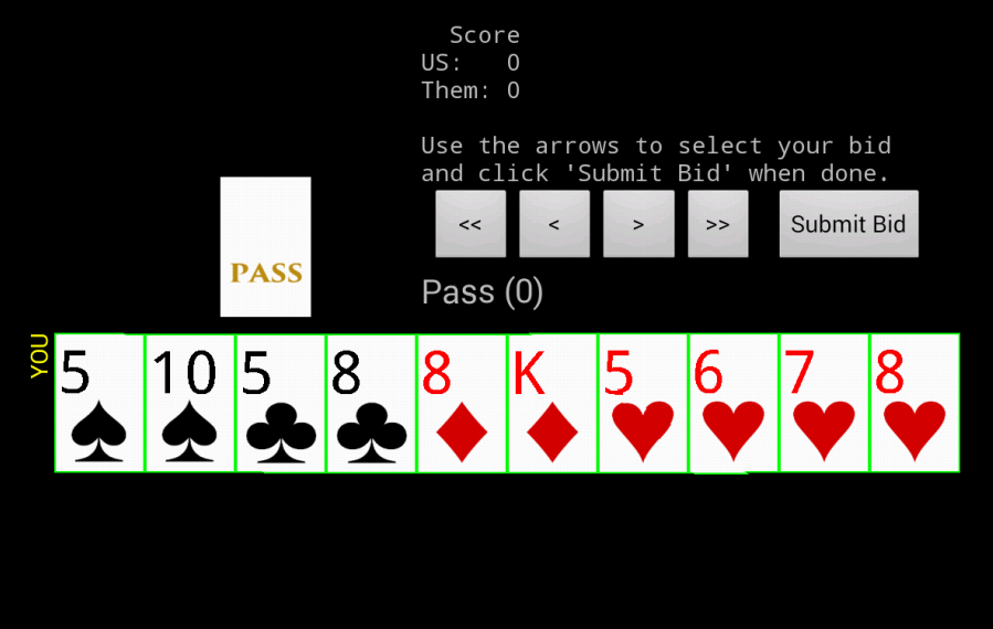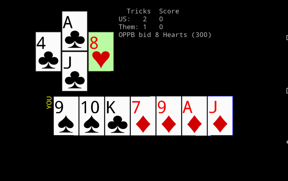 Une offre de 7 ou plus d'un costume signifie que vous et votre partenaire devez prendre autant de trucs avec ce costume en tant que Trump. Joker est haut, puis Jack droit, gauche Jack (autre Jack de la même couleur), Ace, en bas à 4.