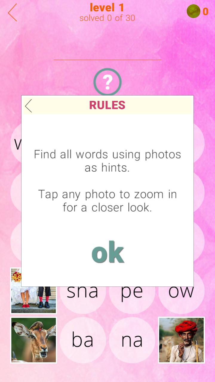 One word per photo. 30 words per level. 630 words in the game. Can you find all of them? Sometimes you have to think beyond the obvious. Good luck!