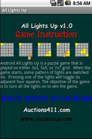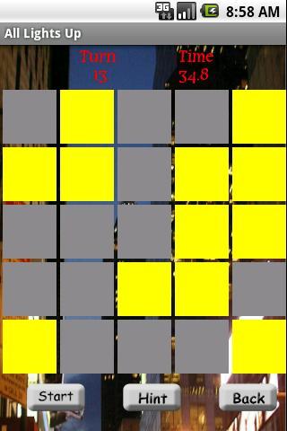 A game with 3X3, 5X5, and 7X7 tiles representing lights on or off in a hotel rooms. Players have to switch ON all lights to finish the game. The switches are cross-wired to neighboring rooms that turn-on one room does turn-off neighboring rooms. Try to light-up all the rooms as quickly as possible. Hints are available.