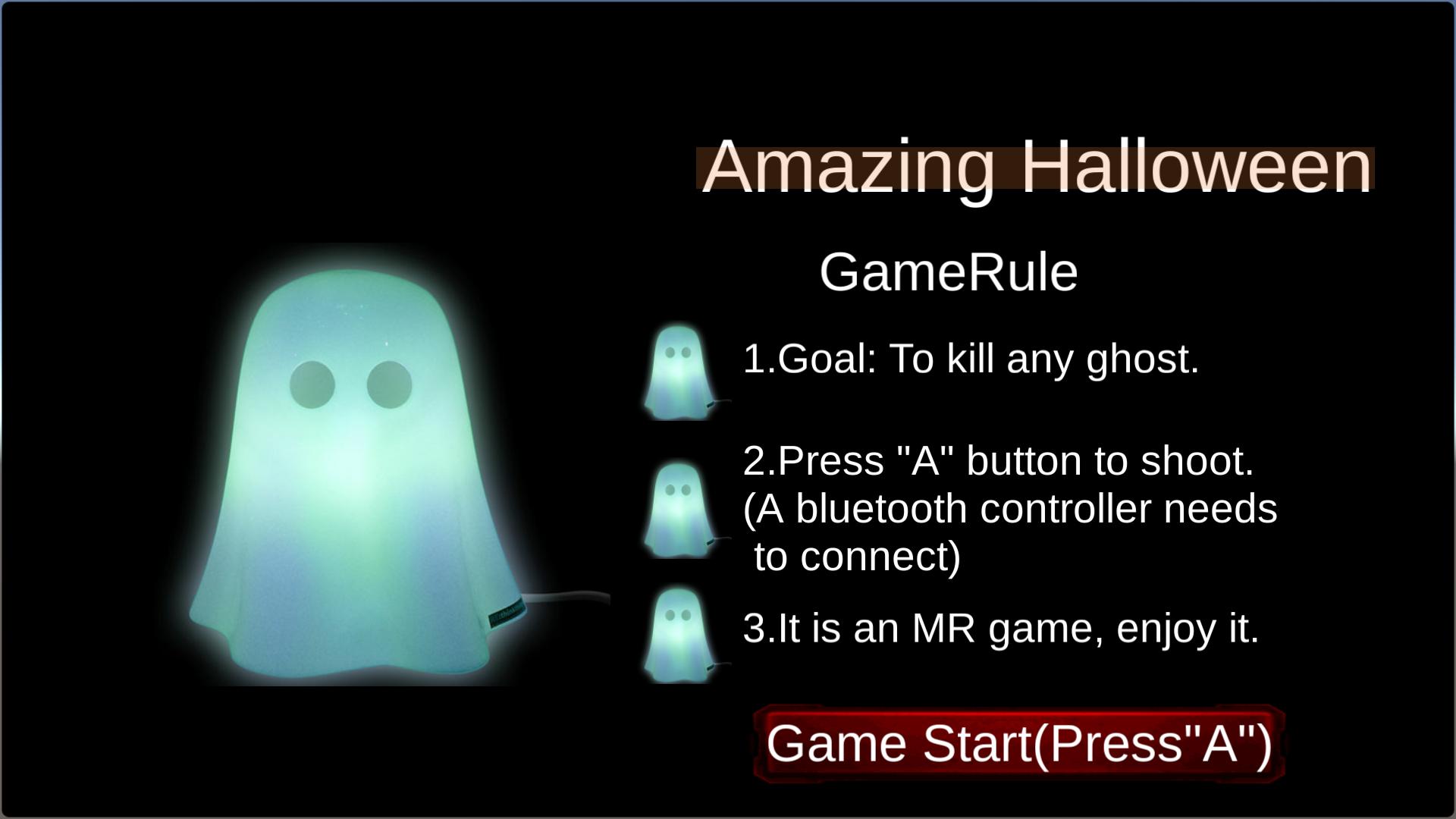 This application is suitable for VR-Box and Bluetooth joystick. When the user is moving in real life, the user will see different directions. Meanwhile, users can kill ghosts when pressing the "A" button in the Bluetooth joystick.
