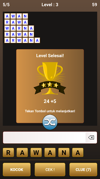 The Indonesian anagram game has hundreds of levels, you have to complete each level by answering all the requested words correctly, each level of the game will be said to be finished if all the requested words have been answered, you will get points or scores of the number of characters that you have successfully compiled.