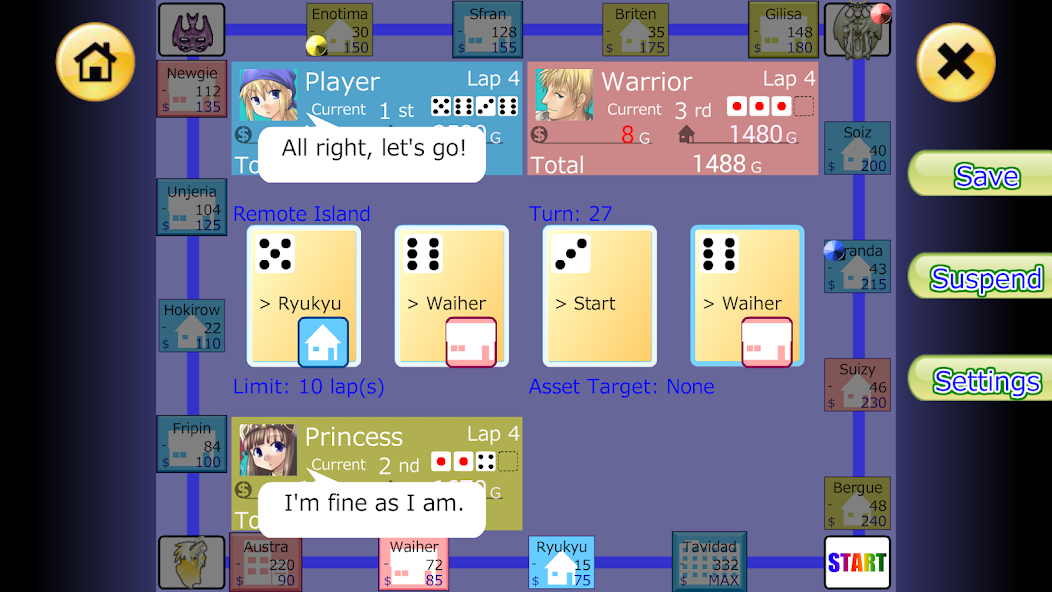 Buy lots of Properties, raise your rank through Investments, and collect Rent from your opponents!