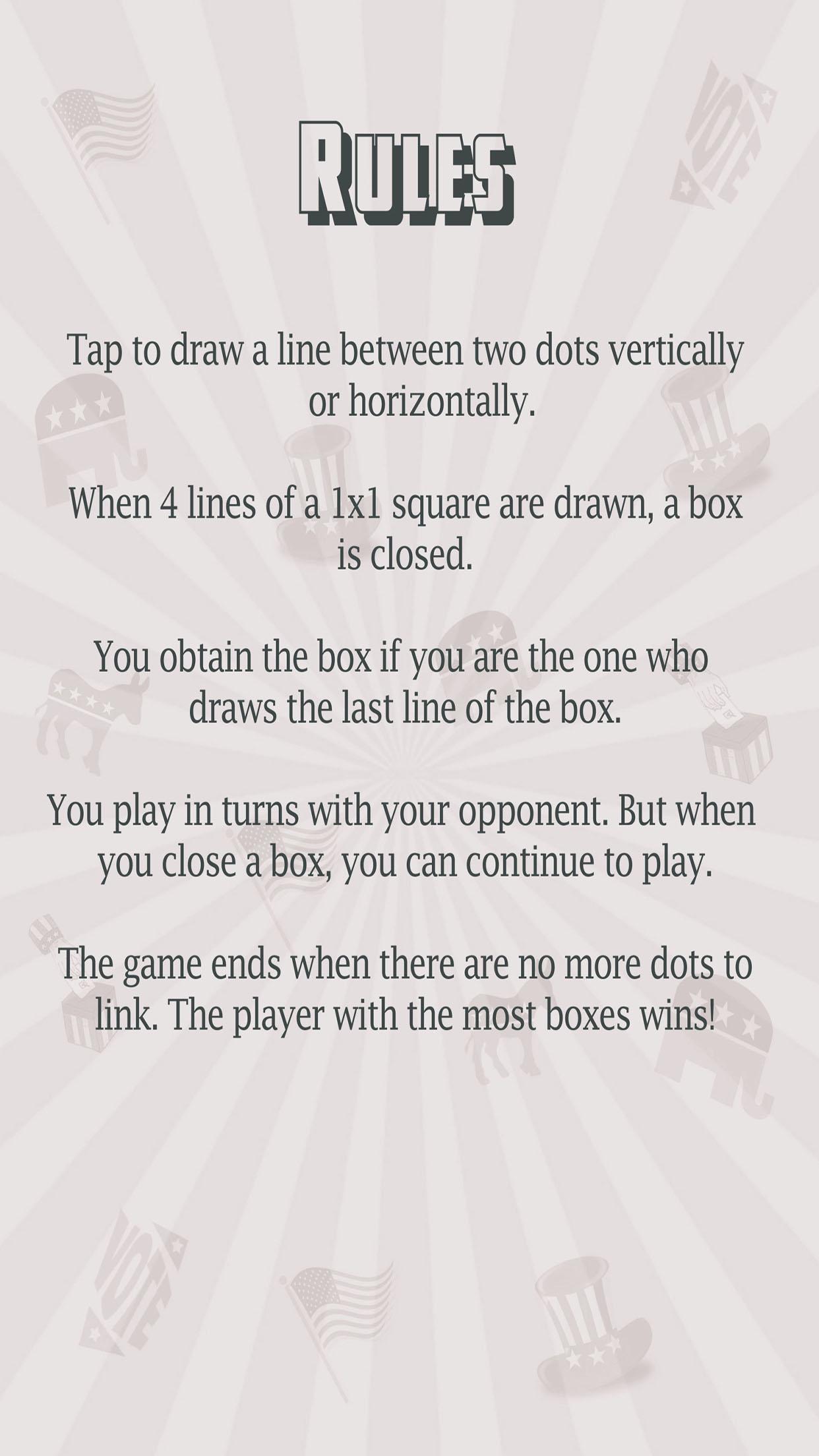 Connect two dots in this squares puzzle game with a straight line horizontally or vertically. You and your opponent draw lines in turn. When four lines of a 1x1 square are drawn, a box is closed. Only the one who draws the last line of the square claim the territory of the box.