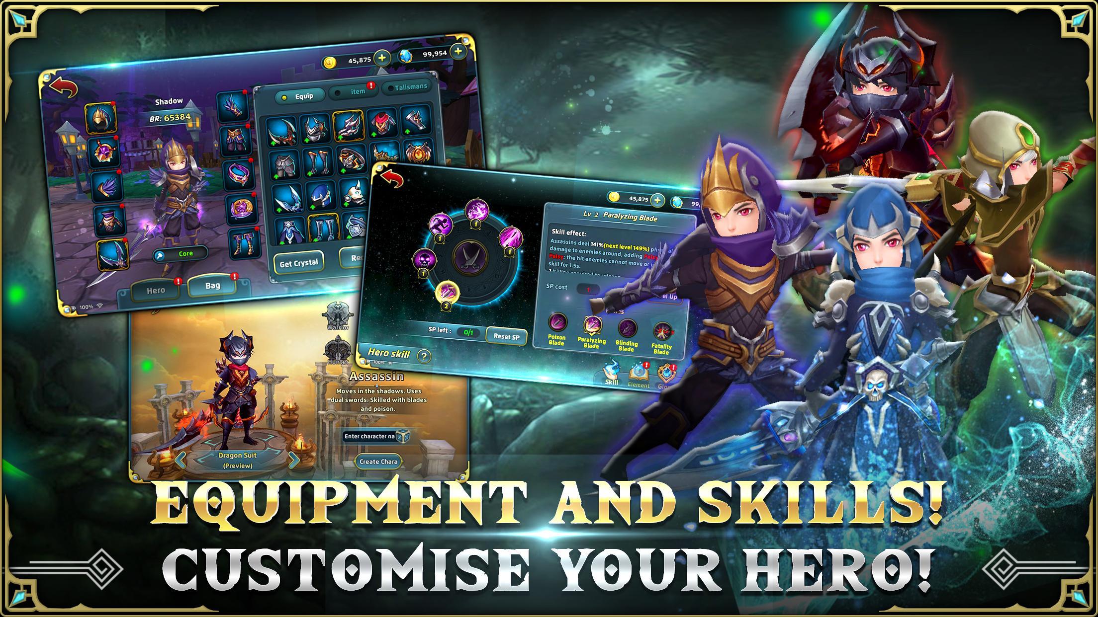Customise your hero with different equipment, abilities and skills to suit your play style and make it your own story and fantasy. Different armour and wings to make you stand out from the crowd. Embark on the quest of a lifetime with a miniature hero version of yourself right on your phone!