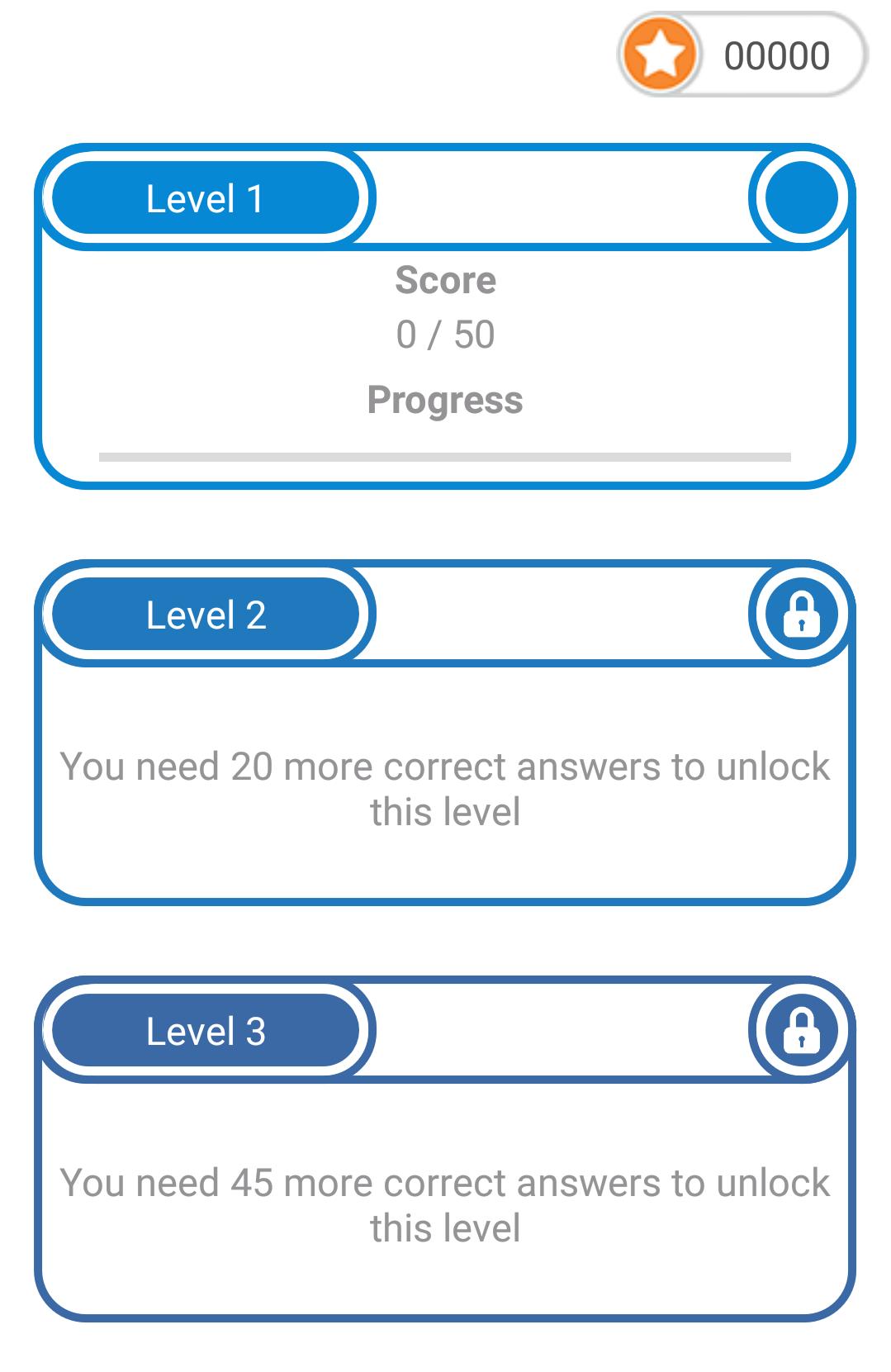 Each of the Quiz and Trivia games has multiple levels to unlock by guessing the correct answer to a set number of the puzzles in the previous levels.