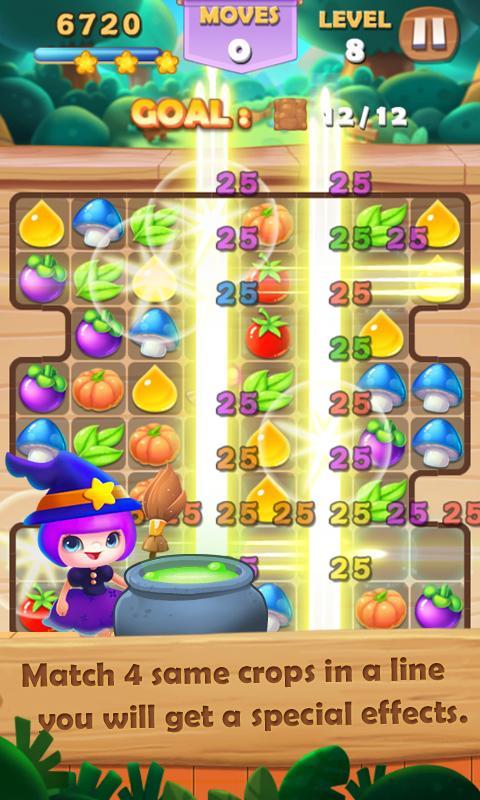- Match 4 same crops in a line or row, you will get a special crops which can eliminate all the crops in a whole line or row.
