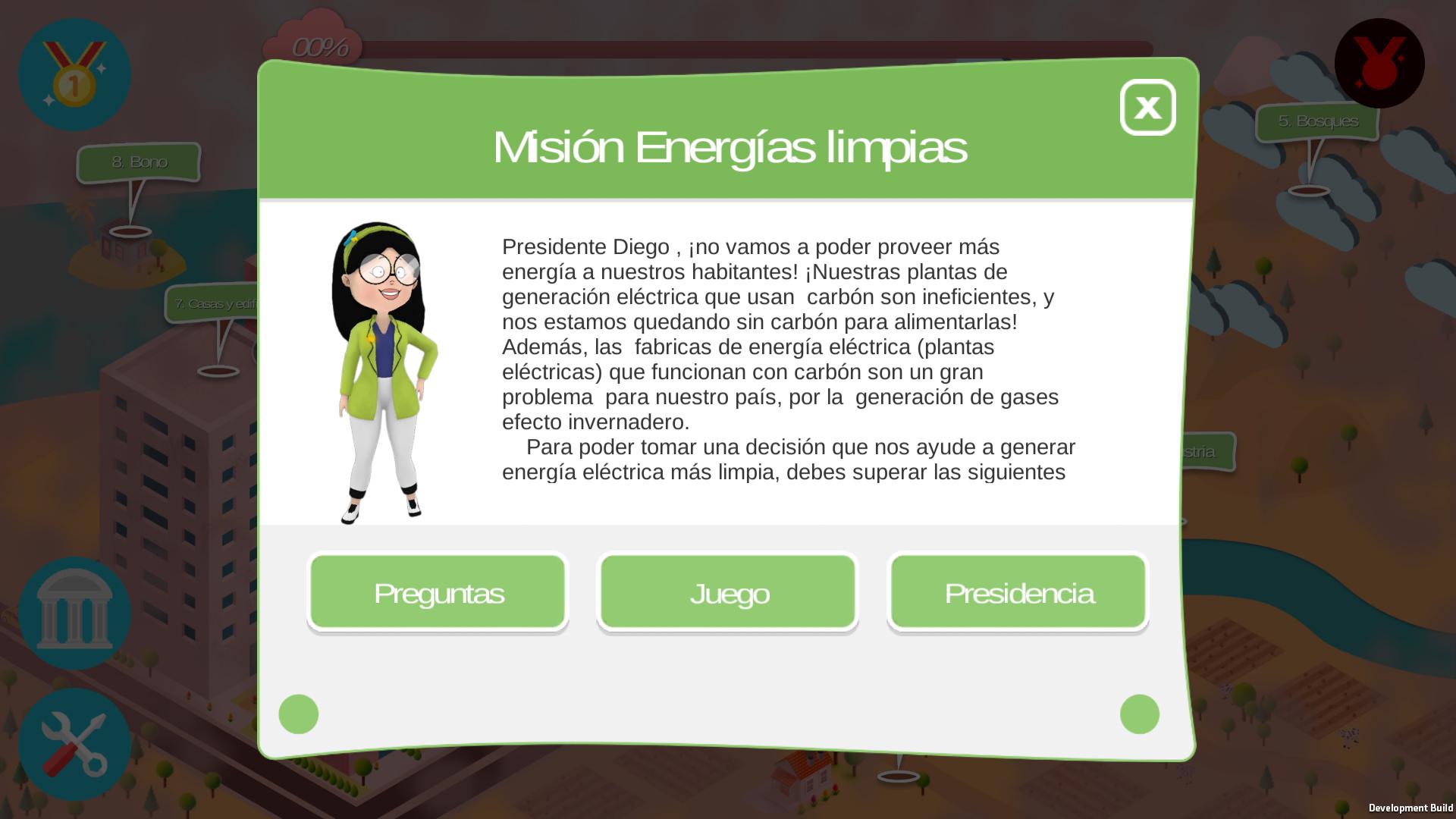 The objective is that the player occupies the role of decision maker (president of Mi Colombia 2050 ) to reduce the levels of greenhouse gas emissions in his country. This is done by obtaining credits (currencies) in order to accumulate an investment budget for the implementation of mitigation measures in different sectors of the economy (transport, housing, waste, agriculture and livestock, forestry, etc.).