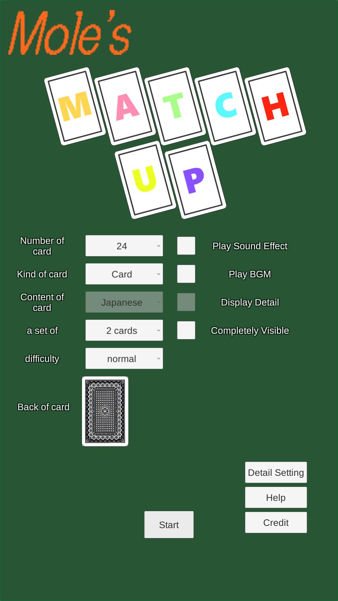 You can select the number of cards used in the game from the set of 24/36/48.