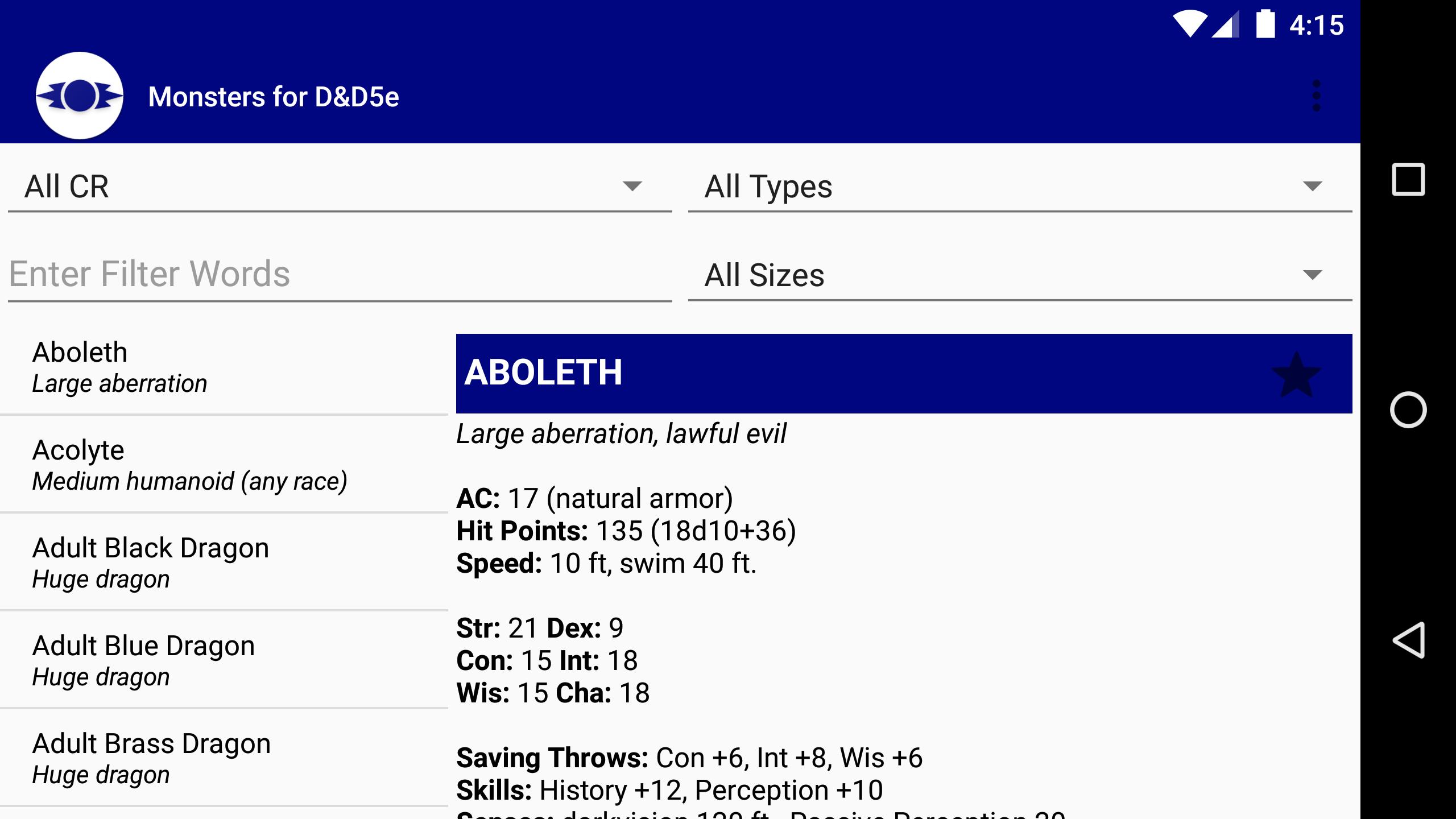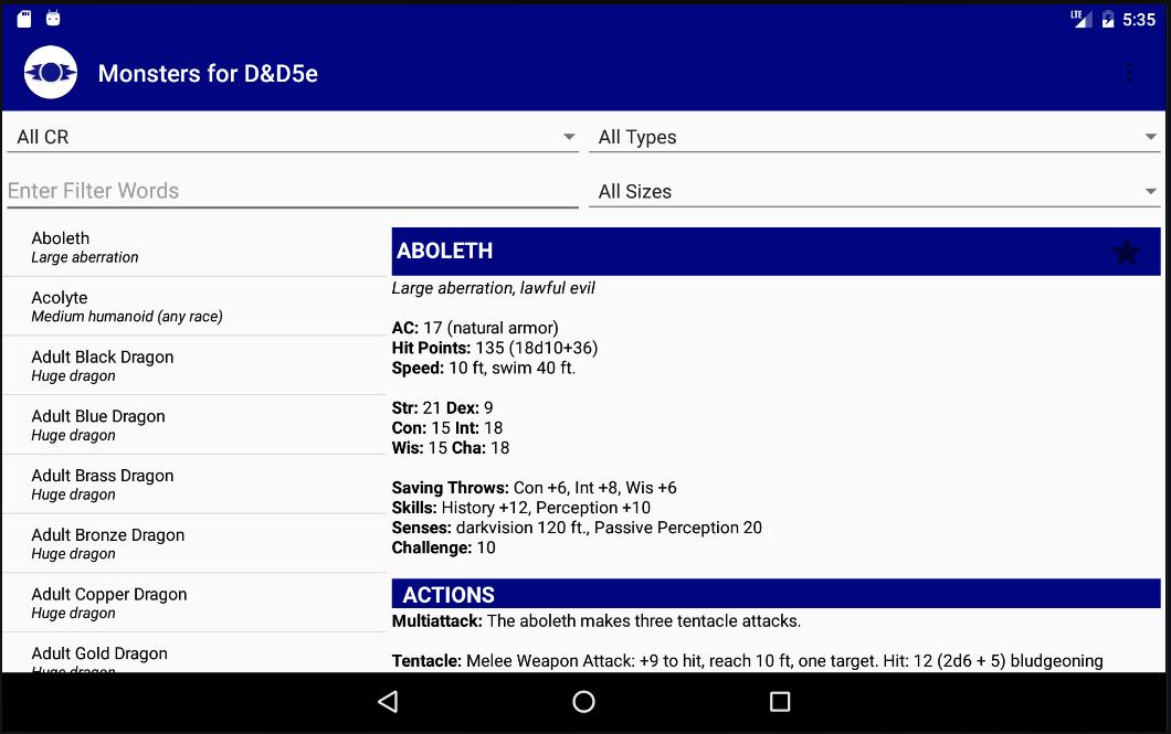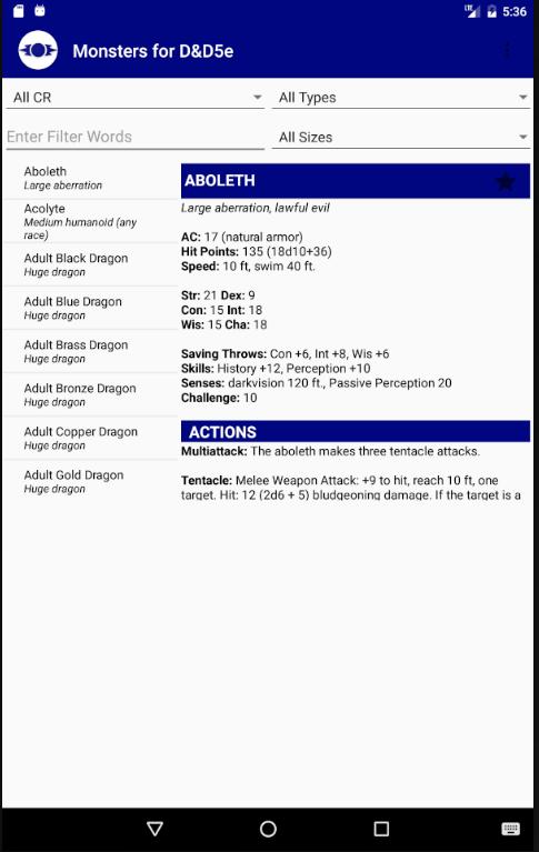 ✓ Sort by Type, Size and Challenge Rating to quickly find an Monster.