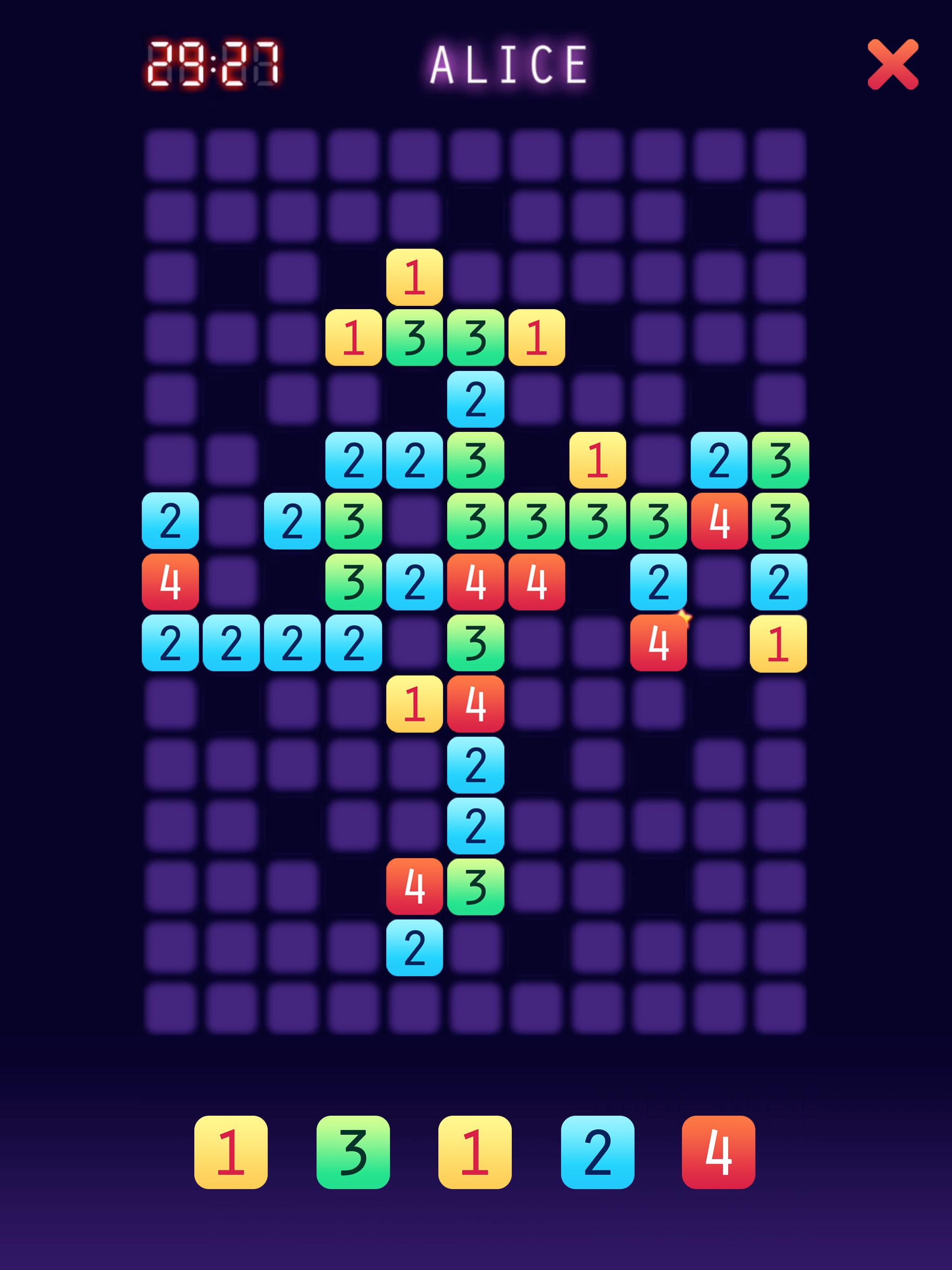 Start with a board that has 145 squares to play, 20 black holes and number 4 in the center. You get with five random pieces, numbered from 1 to 4 telling you how many sides you can connect to another piece. Take your turn to place your piece in a position with the right number of connections to other pieces. You have 30 seconds the make your move. Each played piece gets replaced by a random new one. Place the last possible piece on the board to win.