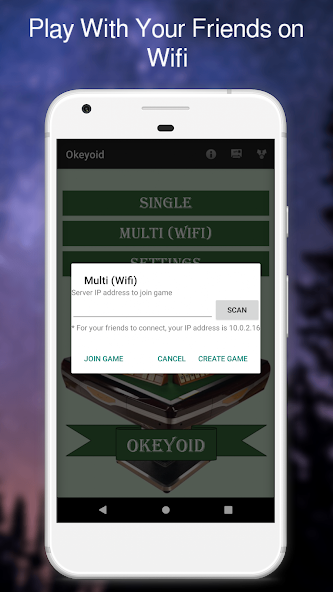 - To play with your friends, you must connect to a wireless network using Wi-Fi. You can create your own Okeyoid server and have your friends connect to your device or join an already created server (you can use network scan functionality to find available servers). If your device supports Wi-Fi Hotspot, you can create and use your own wireless network to play multiplayer.