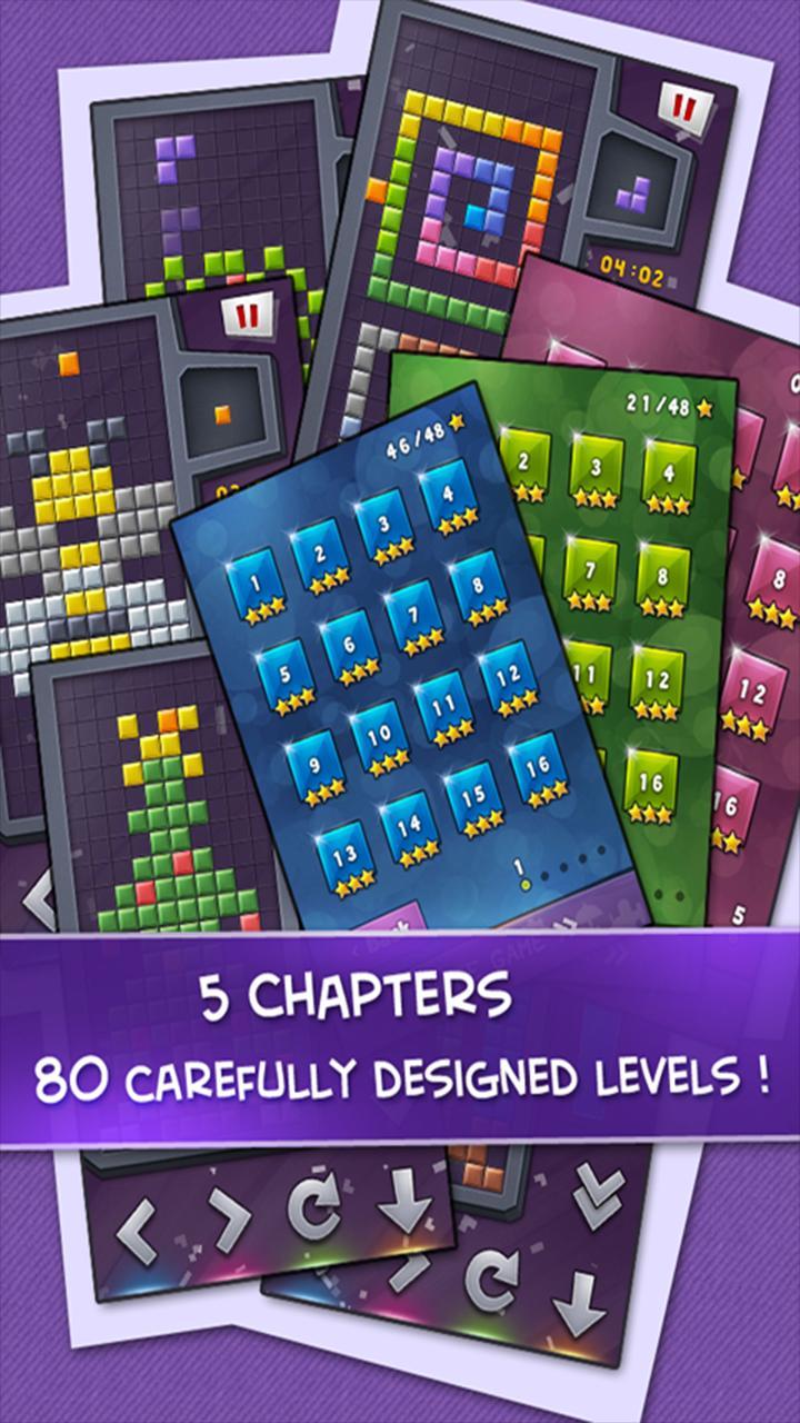 There are 240 carefully designed levels in 5 chapters with the increasing difficulty of levels, Ponon guarantees you will linger on our games while forget passing of the time.Remove the square to under the green safe line in limited time enables you to get more stars as well as to break your personal record!