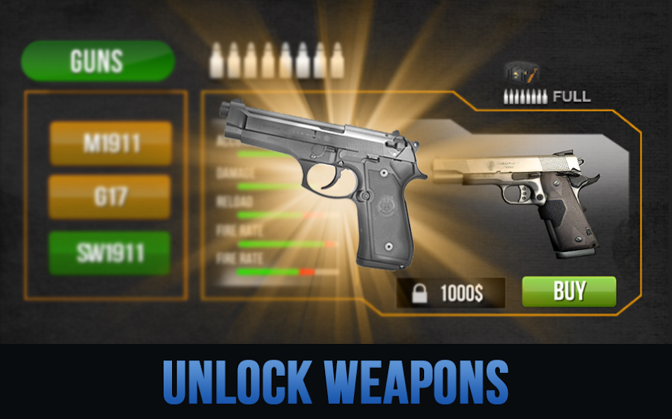 Upgrade your guns to aim and shoot more efficiently. This shooting range gives you a chance to aim at multiple targets and shoot with just one bullet. Challenge yourself and be part of this realistic fire battle and become the best shooter of accuracy, precision, and speed in shooting games challenge.