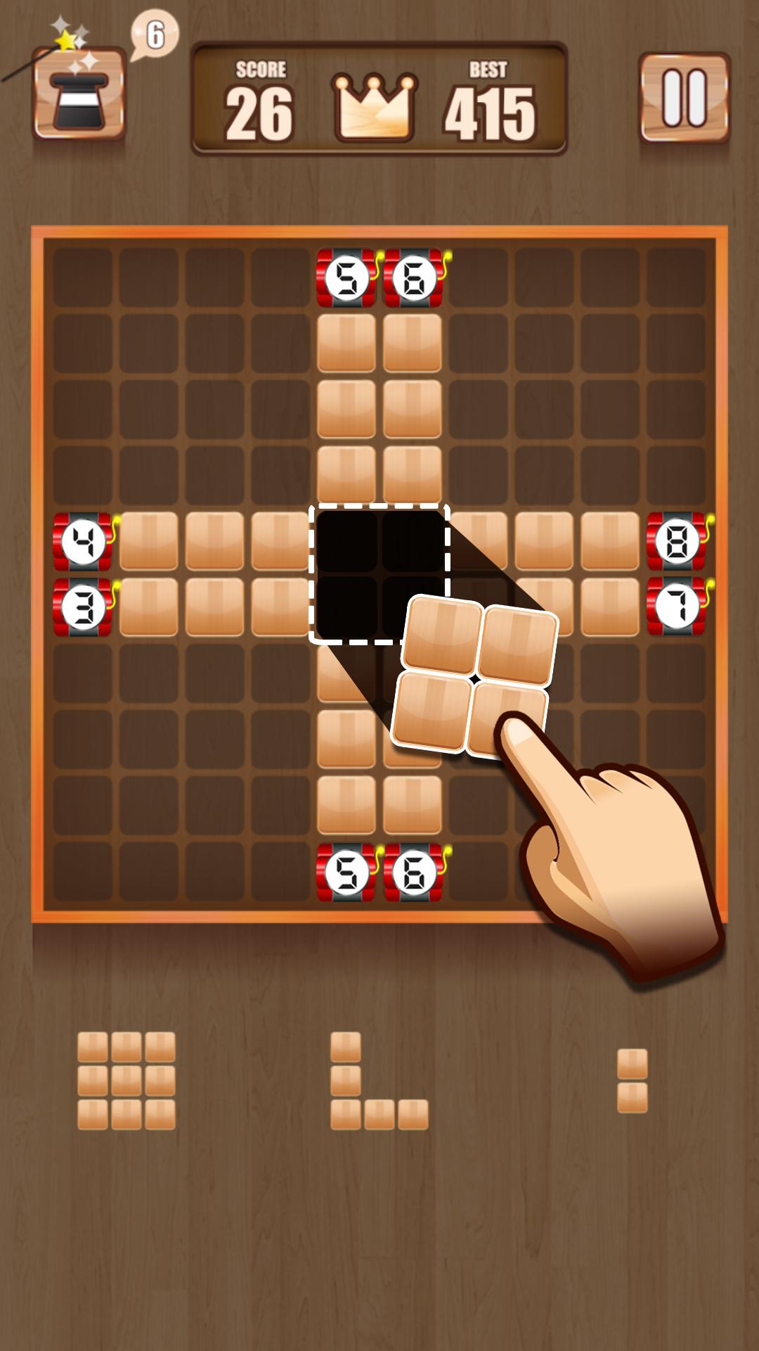 Wood Block Blitz Puzzle is a simple puzzle game with no colour matching and time limits. Fill the row or column to break the blocks. It is an additive block puzzle game. The more blocks you break the more points you will get.You will surely love this block puzzle mania game .