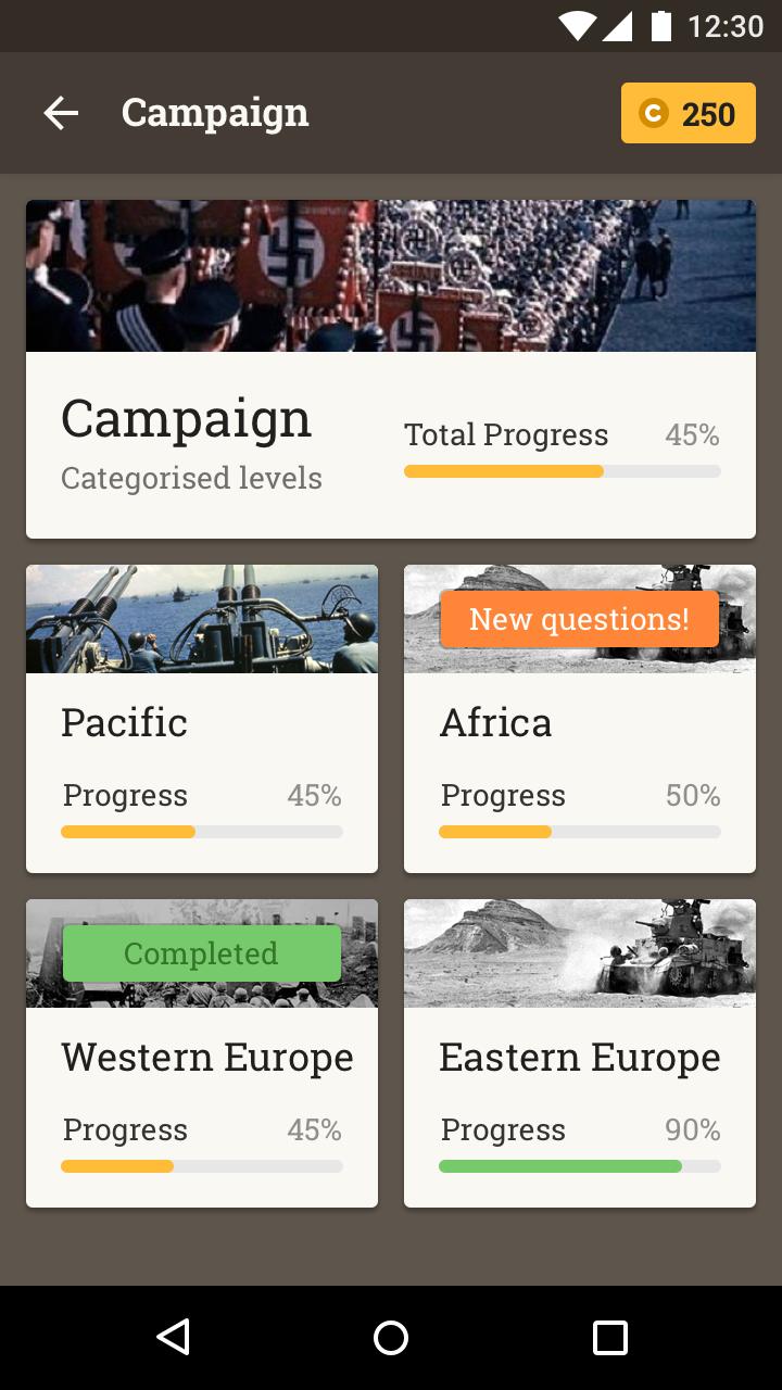 We prepared over 300 questions in categorized campaign with 4 logical WWII categories: