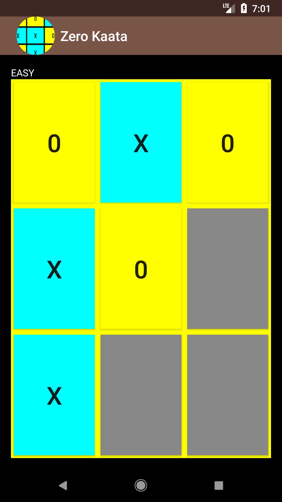 Zero Kaata or Tic-tac-toe (also known as noughts and crosses or Xs and Os) is a paper-and-pencil game for two players, X and O, who take turns marking the spaces in a 3×3 grid. The player who succeeds in placing three of their marks in a horizontal, vertical, or diagonal row wins the game.