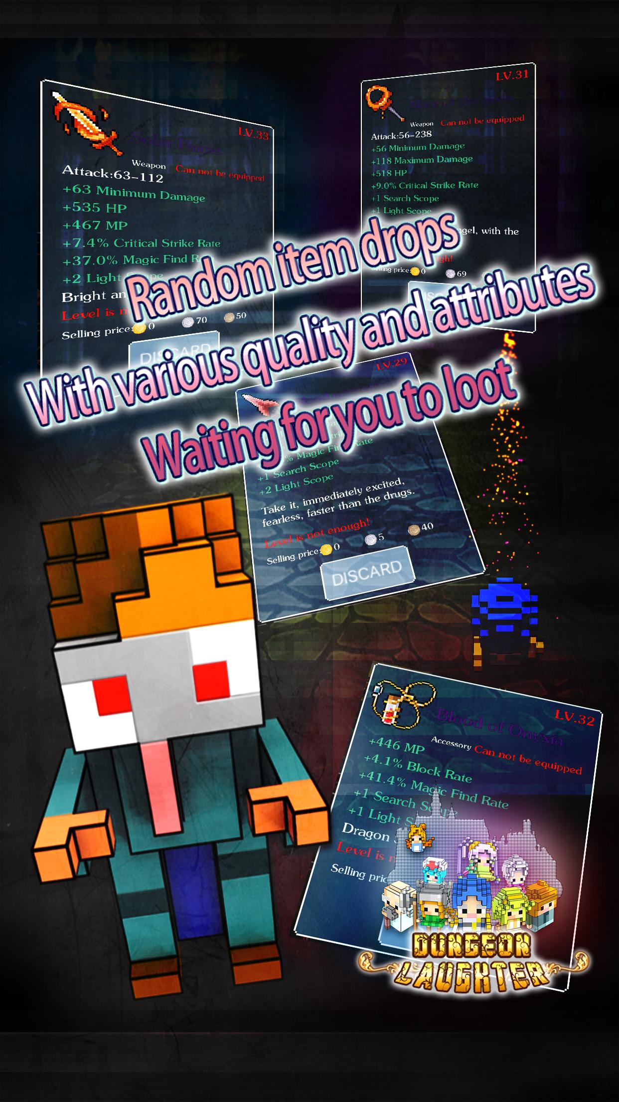 Dengan menggunakan model karakter voxel dan pencahayaan dinamis, gaya seni terlihat gelap dan menggemaskan. Kami juga menambahkan banyak plot klasik game ruang bawah tanah klasik ke kami. Petualangan akan membuat Anda merasakan suasana tegang selama permainan, namun dengan senyum di wajah Anda.