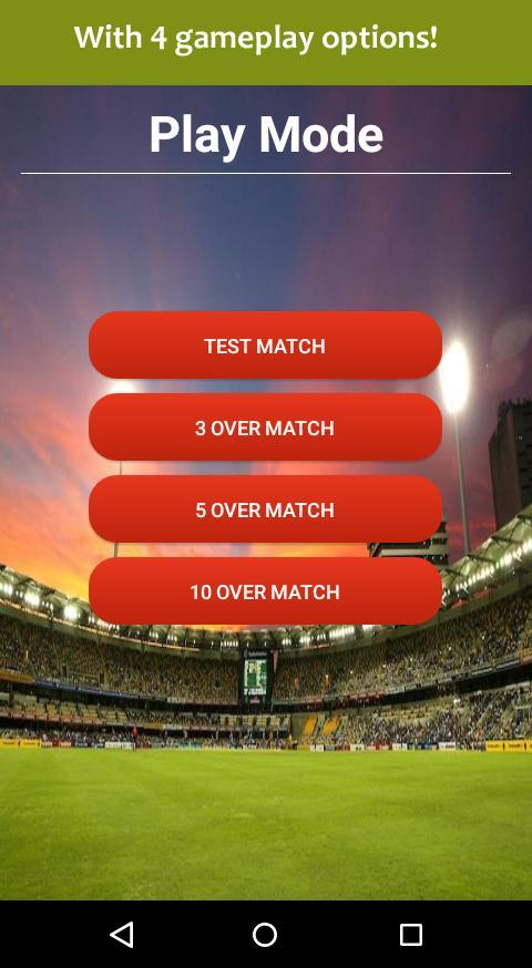 - 4 game-play modes (Test match/3 overs/5 overs/10 overs match)