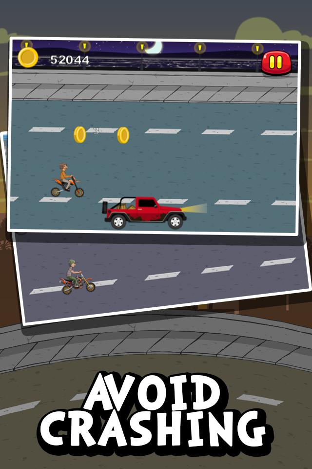 Tekan layar untuk membuat sepeda dan pengendara bergerak ke atas layar ke ujung jalan. Berhentilah menekan layar dan dia akan pindah ke tepi jalan yang lebih rendah. Kumpulkan koin untuk membuka kunci tingkat menantang baru dan pengendara sepeda baru, yang menambah kegembiraan.