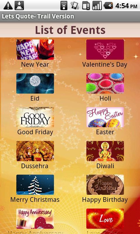 「Let's Quote Application」は、若者と高齢者の両方を対象とした美しいメッセージングアプリケーションです。誕生日、記念日、新年、バレンタインデー、聖金曜日、イースター、クリスマス、ホーリー、ディスヘラ、ディワリなど、さまざまな機会に選択して誰かを送信できる多くの内蔵の引用があります。リストビューまたはグリッドビューを選択するオプションがあります。