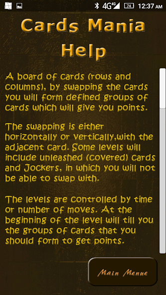 ボード上のカードを交換して、明確なカードのグループを形成して、各レベルのターゲットスコアを達成します。チップをボーナスポイントと交換して、ニーズに合っていると見なされます。いくつかの高度なレベルでは、ジョーカーと隠されたカードが表示されます。