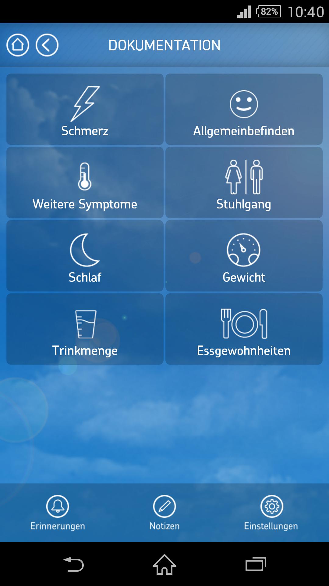 실제 일기 기능을 사용하면 전형적인 증상과 질병의 영향을 모두 쉽게 기록 할 수 있습니다. 여기에는 장 움직임, 통증, 일반적인 상태 및 장 밖에서 가능한 증상이 포함됩니다. 또한 수면 장애, 체중 발달, 음료량 및 식습관은 몇 번의 클릭으로 기록 될 수 있습니다.
