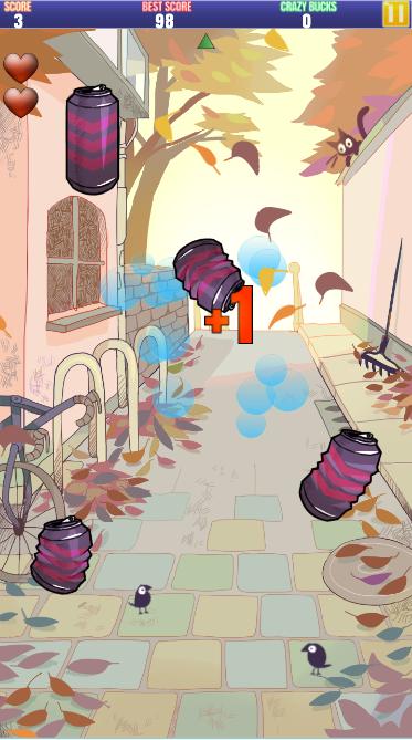 Keep the soda cans in the air by tapping them as they fall! Catch and earn Crazy Bucks and customize the play experience with new mystery cans and great looking backgrounds! There's even one with a blinking cat and a couple of birds! Are you a Crazy Cans ' Samurai? How many can you juggle in the air before one slips by?