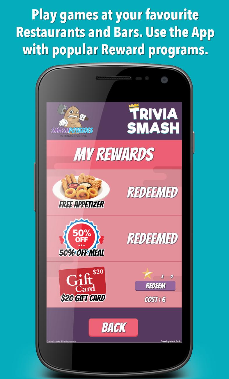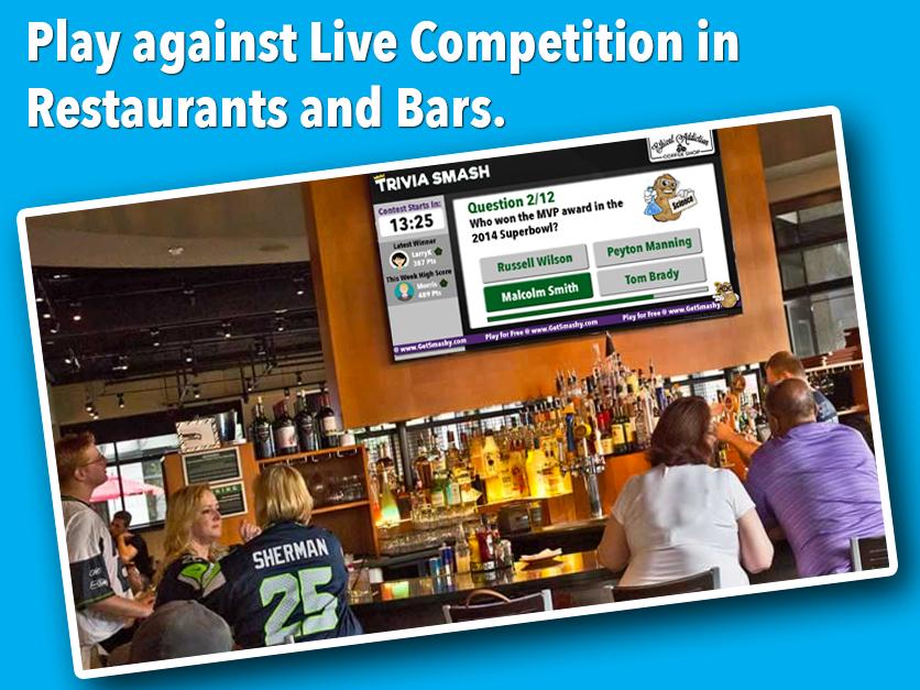 당신의 두뇌는 얼마나 많은 임의의 지식을 가지고 있습니까? 싱글 플레이어 모드에서 플레이하여 자신을 테스트하거나 궁극적 인 도전에서 다른 사람들과 대결하십시오. 그리고 당신이 좋아하는 레스토랑과 바에서 Trivia Smash를 연주 할 수있는 빨리 계속 지켜봐 주시기 바랍니다.