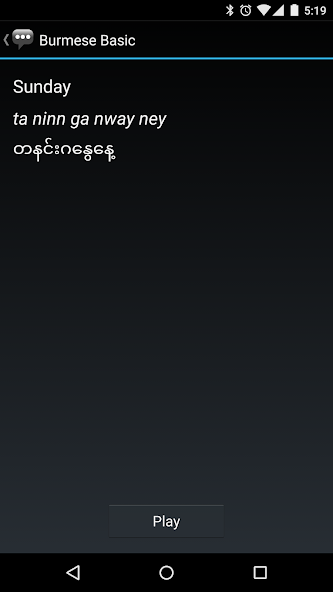 3. Na página de detalhes da frase, a frase birmanesa é mostrada ao lado de sua pronúncia e a frase em inglês equivalente. Pressione o botão Play para ouvir a pronúncia de áudio por um alto -falante nativo.