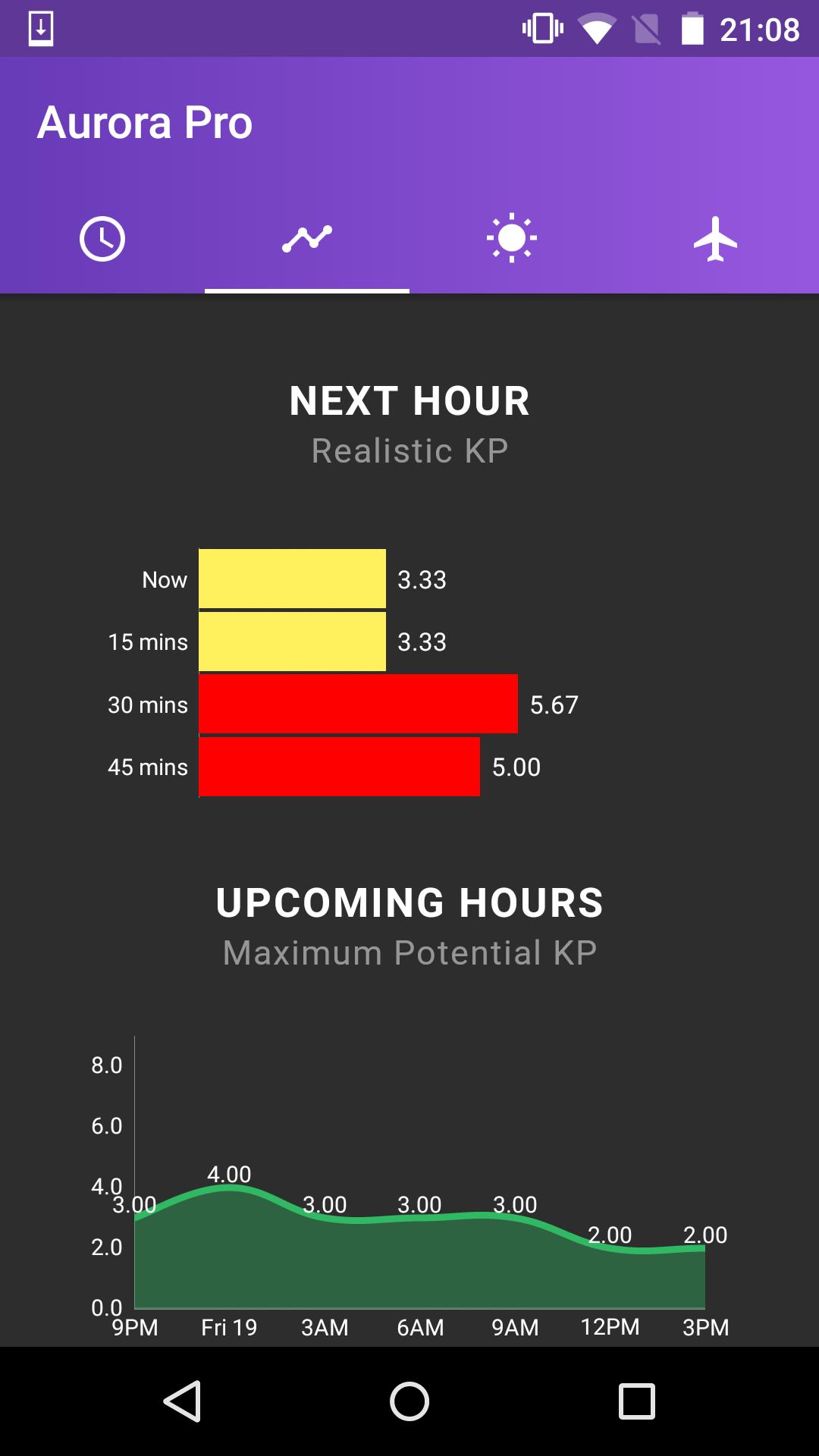 - Previsões para a próxima hora, várias horas e várias semanas para que você possa planejar suas luzes do norte com muito antecedência (sujeitas a condições climáticas).