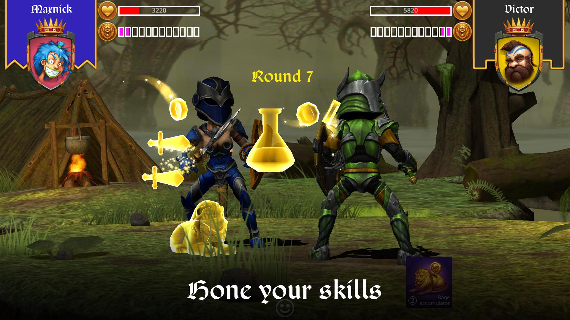 Para alcançar a vitória, escolha a armadura firme e a lâmina mais afiada. O mais importante de tudo, no entanto, é sua intuição - a capacidade de adivinhar o próximo passo do seu oponente. A fortuna favorece o forte! Os inimigos mais corajosos e qualificados só serão vencidos por um grande guerreiro, cujo braço atinge verdadeiro, e cuja mente é tão nítida e rápida quanto a ponta de sua espada.