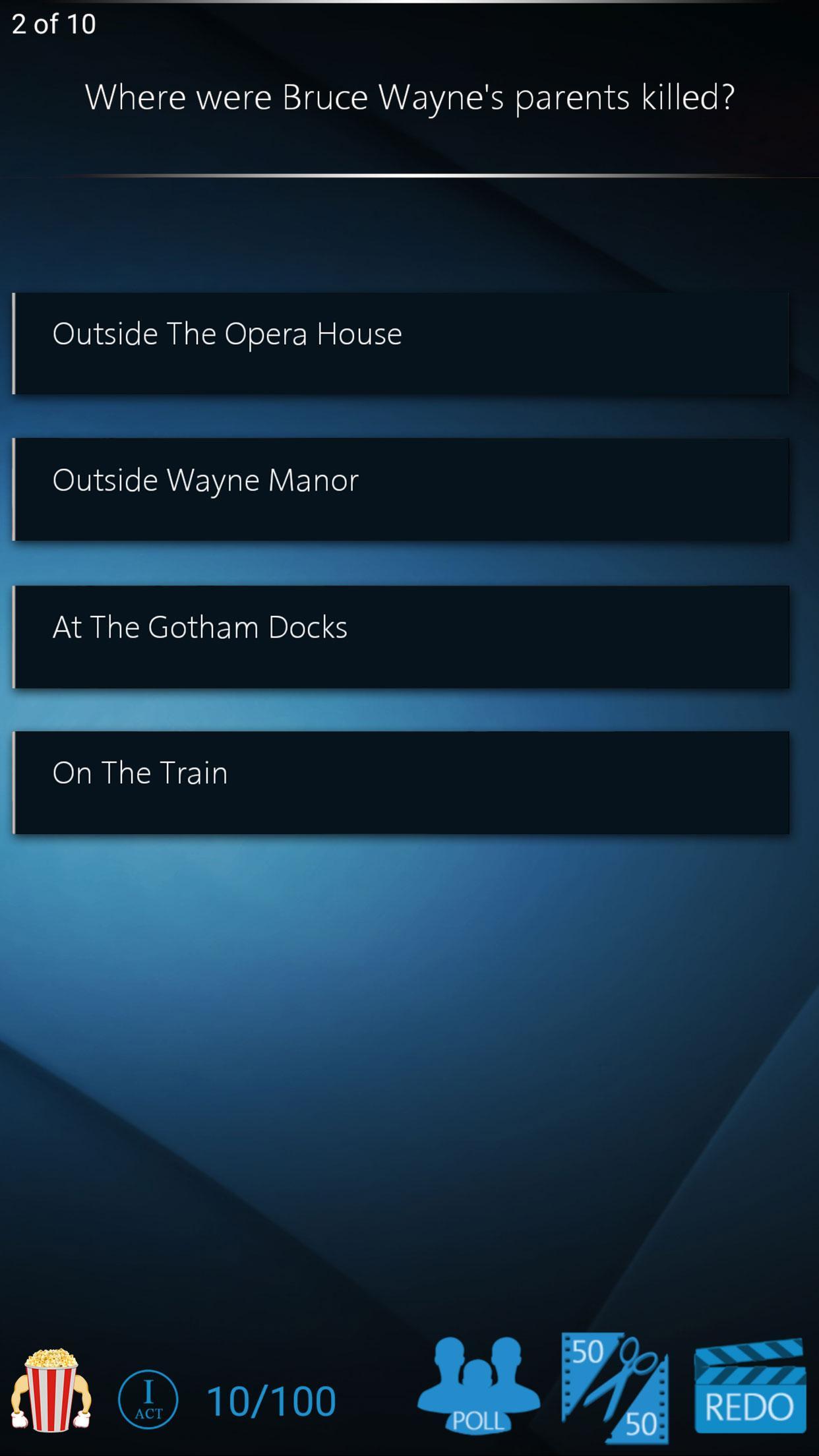 As curiosidades de pipoca leva a noite do cinema a um nível totalmente novo. Teste o seu conhecimento do filme, desafie seus amigos ou sedmente seu próprio show de jogos usando uma variedade de filmes em todos os gêneros. Ganhe as fileiras e suba de um membro da tripulação de limpeza humilde para uma poderosa cabeça de estúdio! Os pontos ganham bônus que podem ser estrategicamente usados em linhas de vida para essas perguntas extras.
